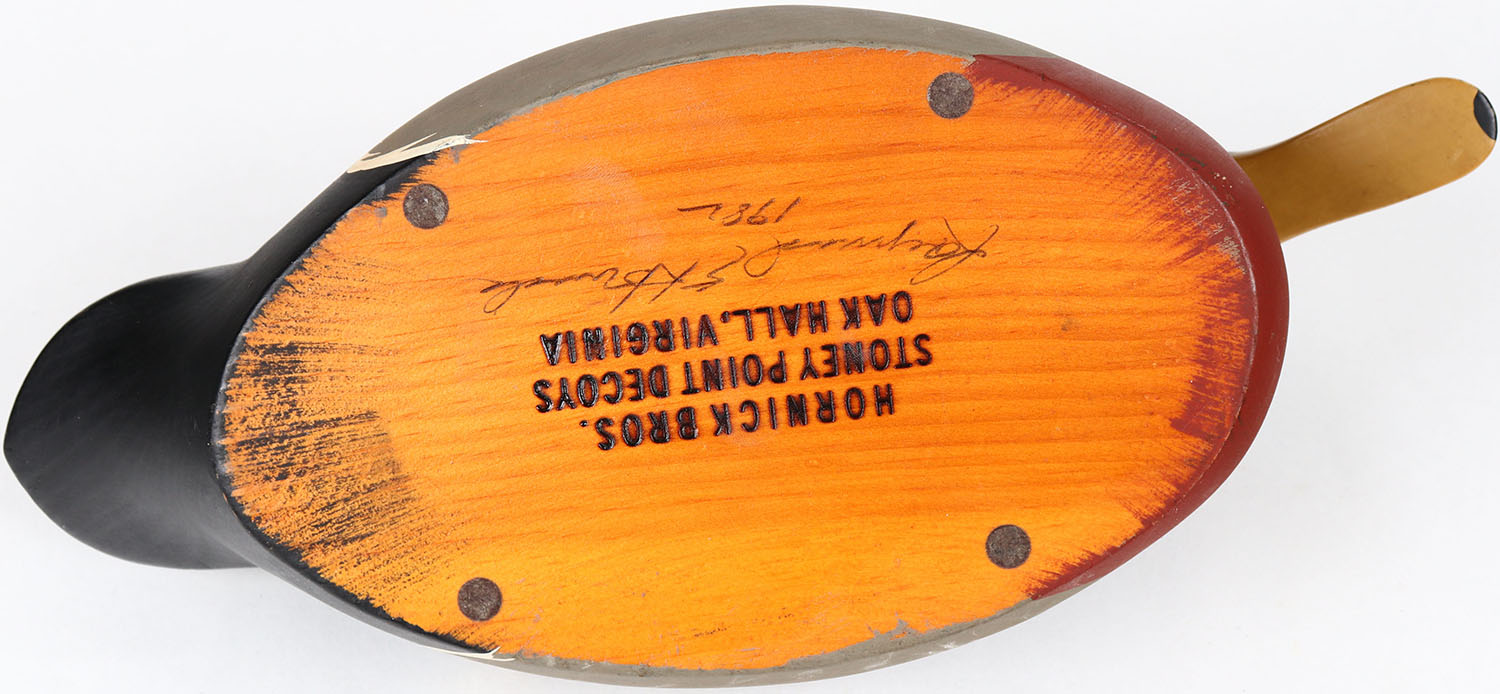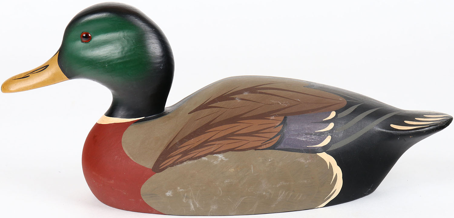 Mallard Drake by Raymond S Howard, Hornkick Bros. Stoney Point Decoys Oak Hall, Virginia, glass eyes, solid wood, structurally excellent, branded M on bottom, original paint. Grade: MINT - Value: 40 to 80