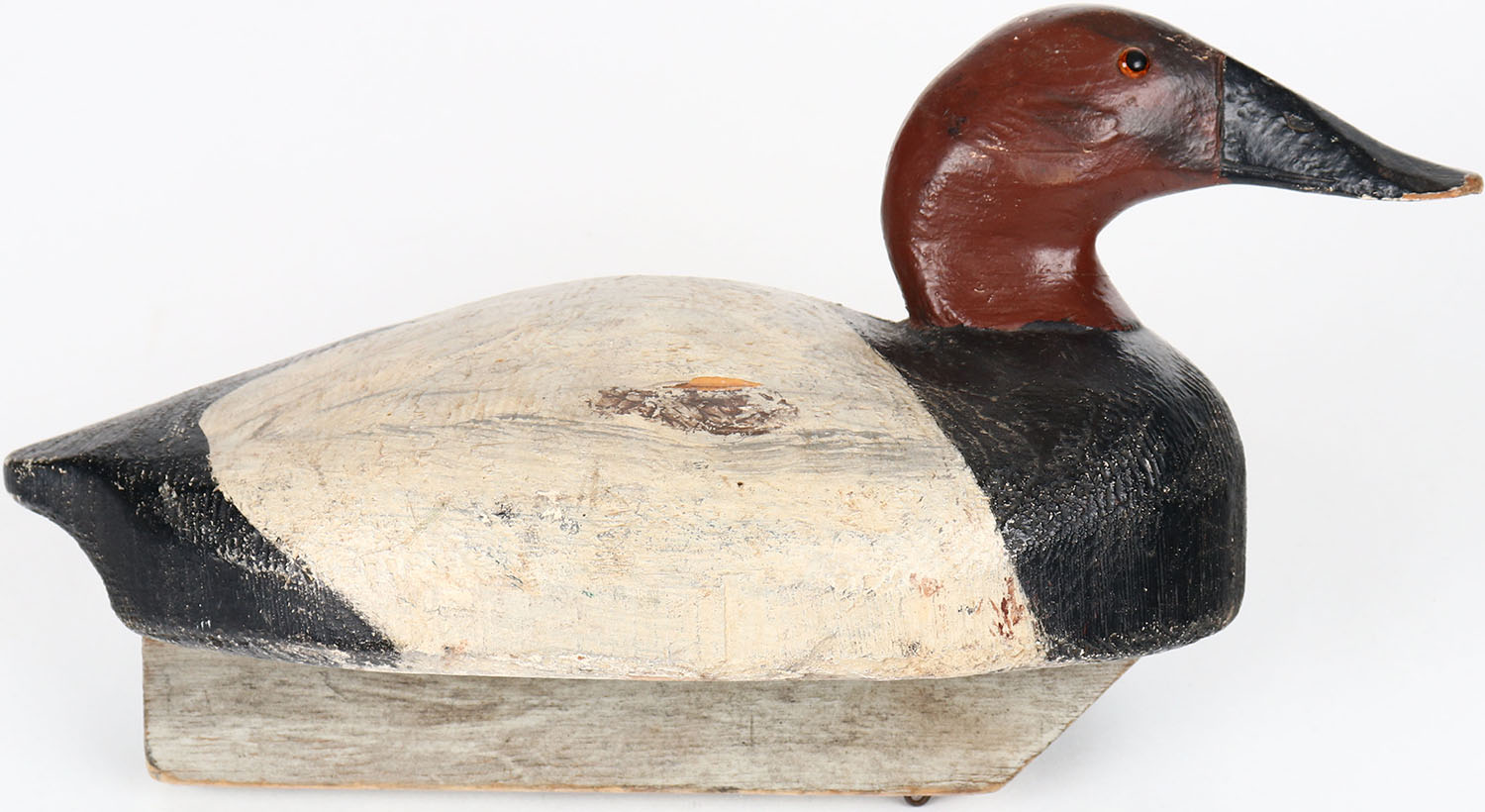 Canvasback Drake by unknown maker, glass eyes, solid wood, structurally excellent, original paint. Grade: Excellent ++ - Value: 50 to 100