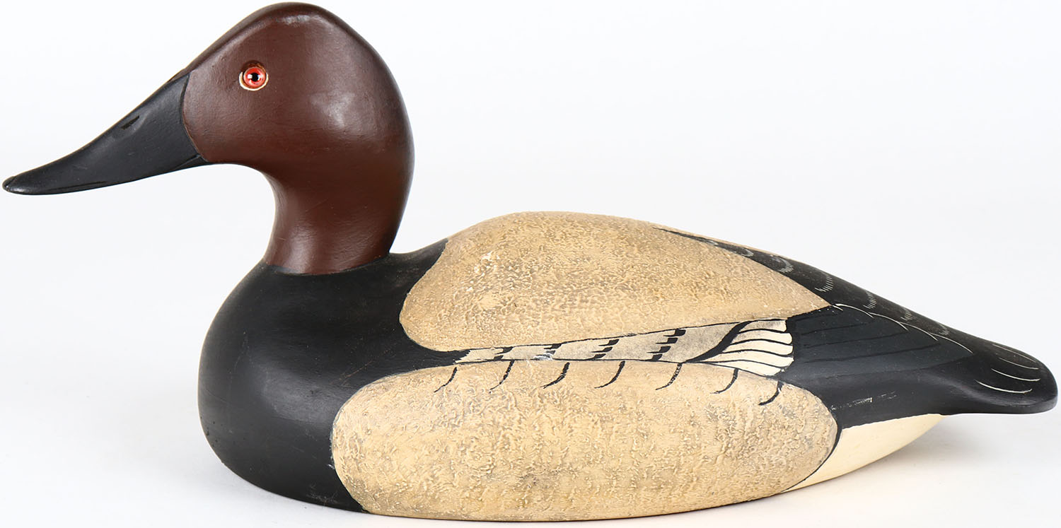 Canvasback Drake by Charles R. Birdsall, Wildfowler Decoys, Point Pleasant, N.J. glass eyes, hollow wood, structurally excellent, branded and signed on bottom, original paint. Grade: MINT - Value: 50 to 100
