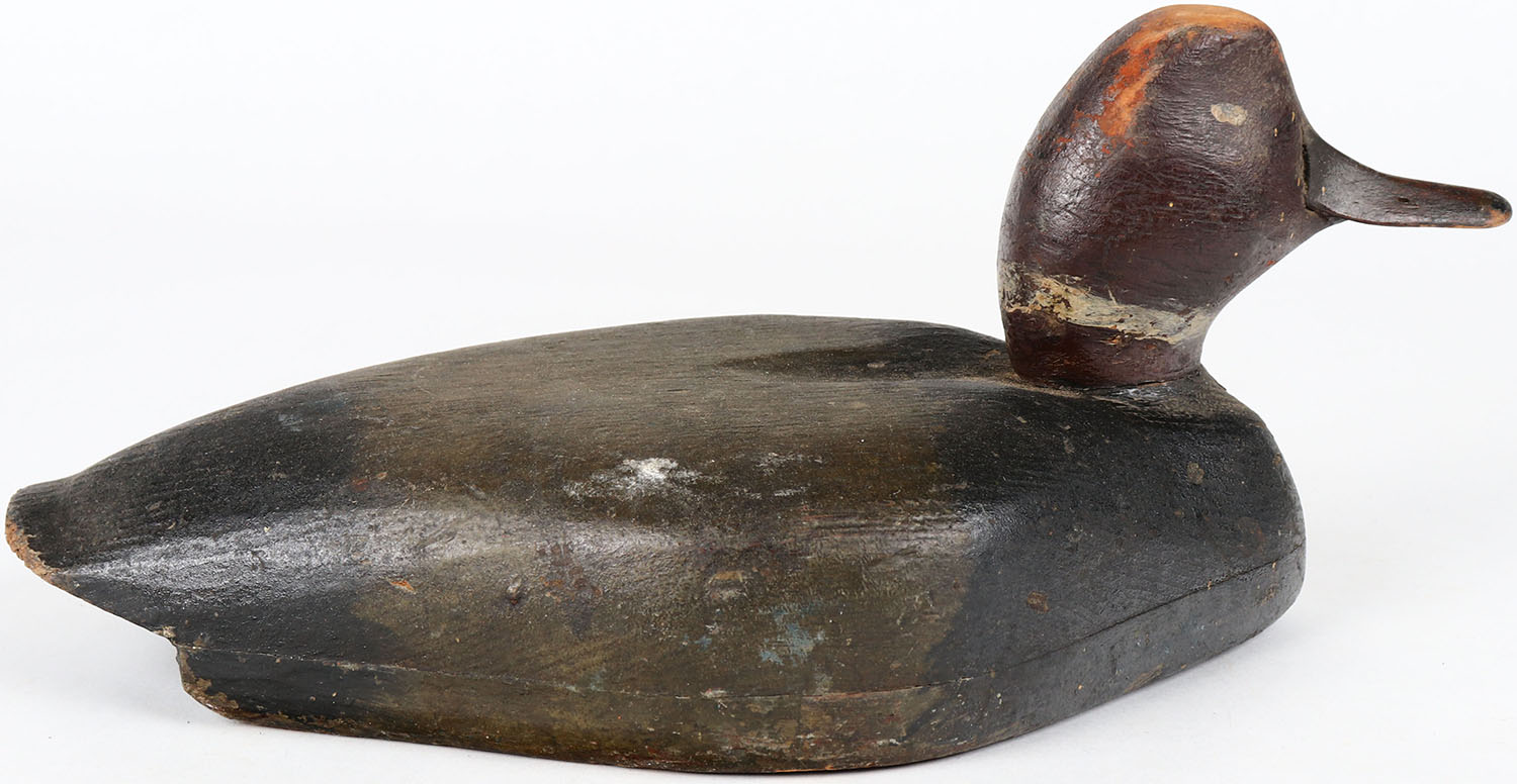Redhead Drake by unknown maker, painted eyes, hollow wood, head is loose, repainted. Grade: Very Good + - Value: 50 to 100