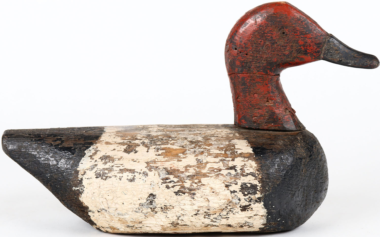 Canvasback Drake by unknown maker, no eyes, solid wood, structurally excellent, original paint. Grade: Very Good + - Value: 50 to 100