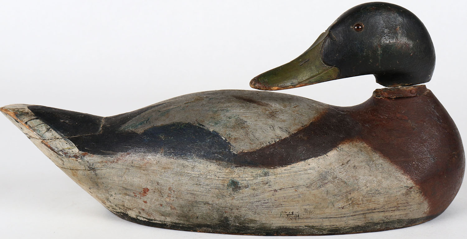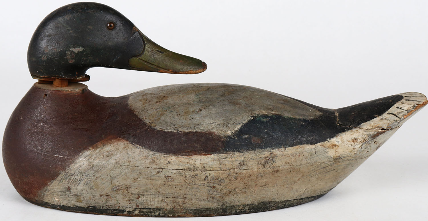 Mallard Drake by Mason Decoy Co., glass eyes, solid wood, head is loose and cracked, original paint. Grade: Very Good ++ - Value: 70 to 300