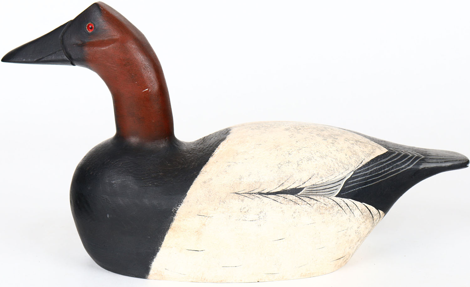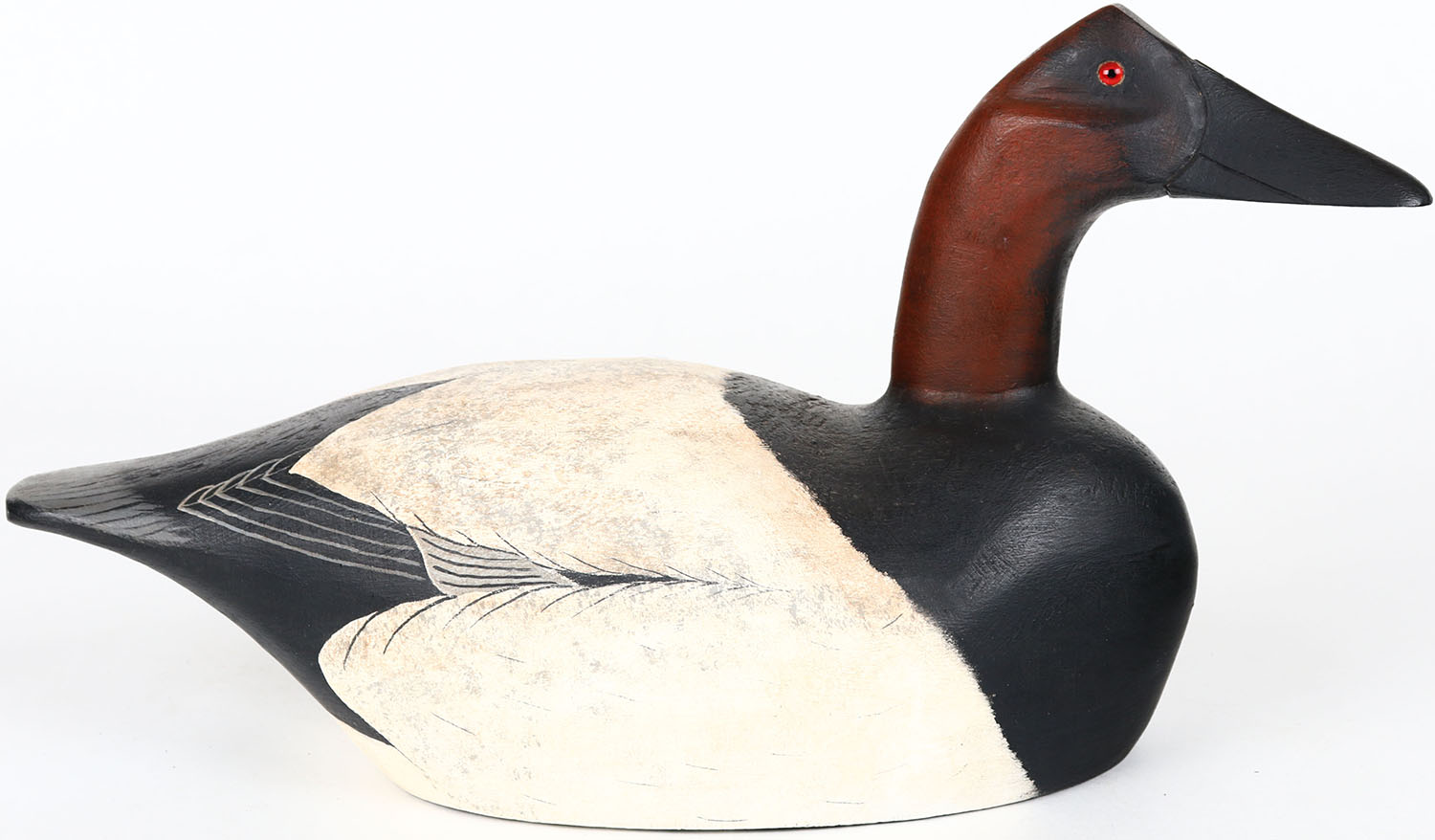 Canvasback Drake by Porters Handcrafted Decoys, George Porter, glass eyes, hollow wood, structurally excellent, signed on bottom, original paint. Grade: Excellent + - Value: 70 to 200