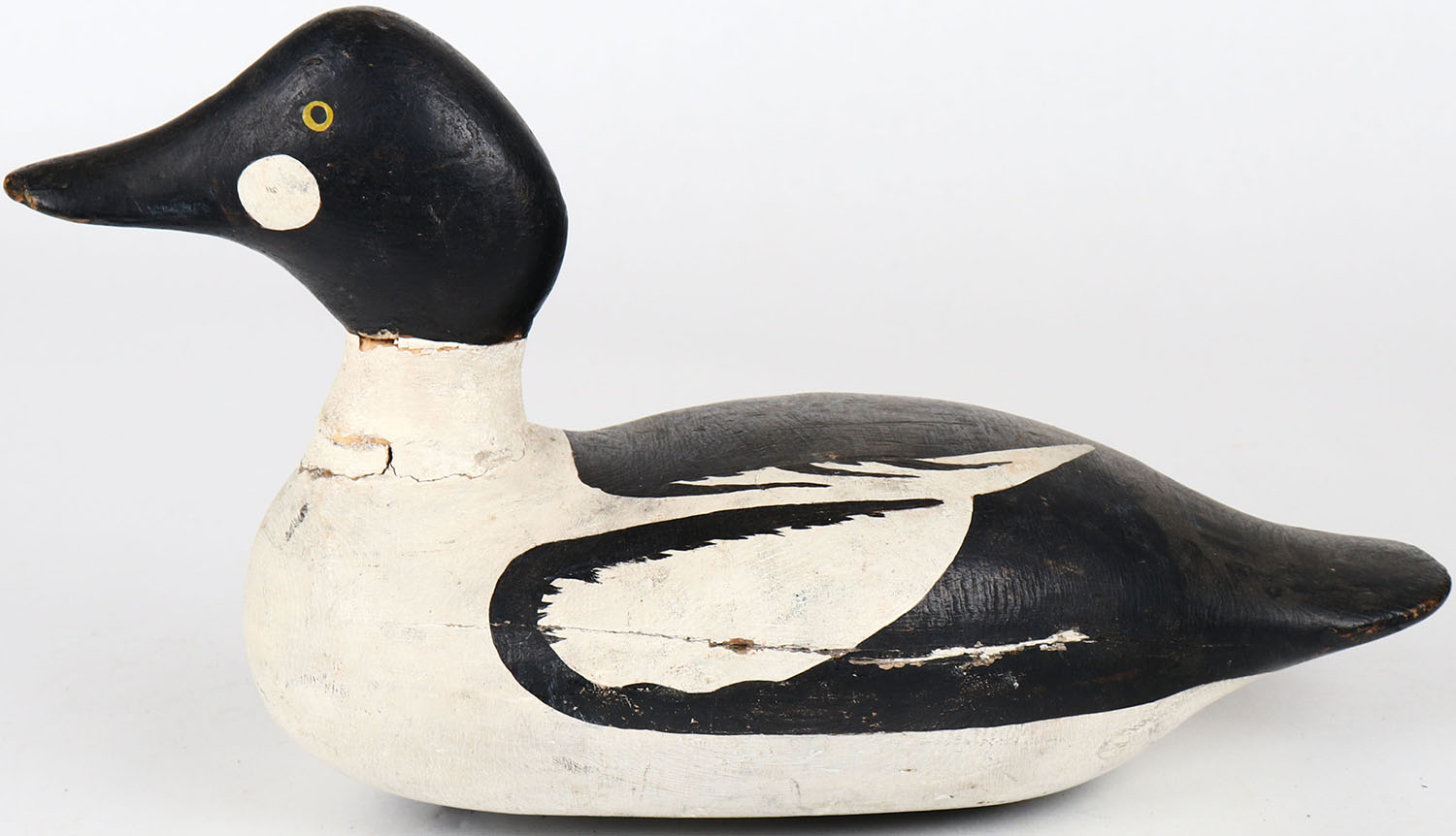 Goldeneye Drake by unknown maker, painted eyes, solid wood, has age cracks on body and around neck, branded on bottom, repainted. Grade: Very Good ++ - Value: 30 to 60