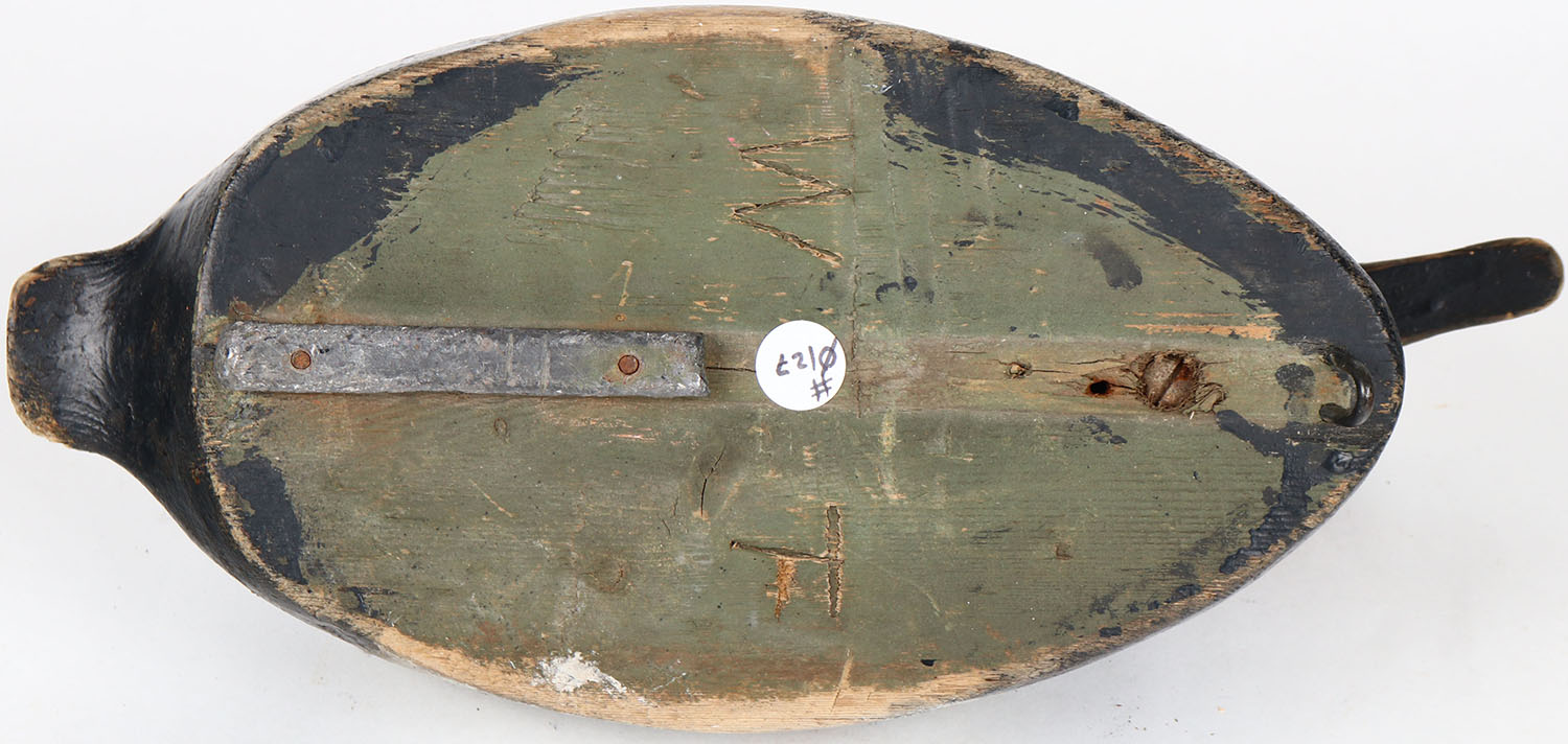 Canvasback Drake by WT, glass eyes, solid wood, head is loose, has age crack on back, branded WT on bottom, original paint. Grade: Very Good ++ - Value: 30 to 60