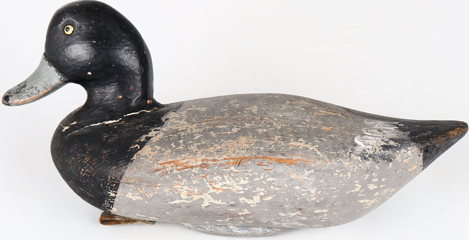 Bluebill Drake by James Holly, Havre de Grace, MD, painted eyes, solid wood, has age cracks on bottom and around neck, signed on bottom, original paint. Grade: Very Good ++ - Value: 60 to 150