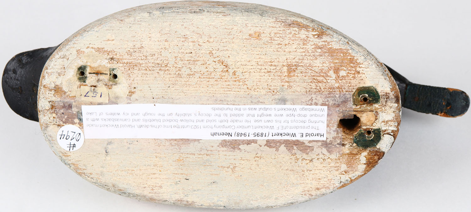 Bluebill Drake by Harold E. Wieckert, glass eyes, solid wood, bill is chipped on top, signed on bottom, original paint. Grade: Very Good ++ - Value: 70 to 200