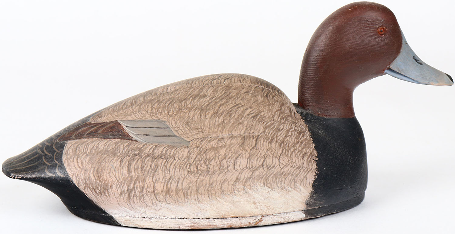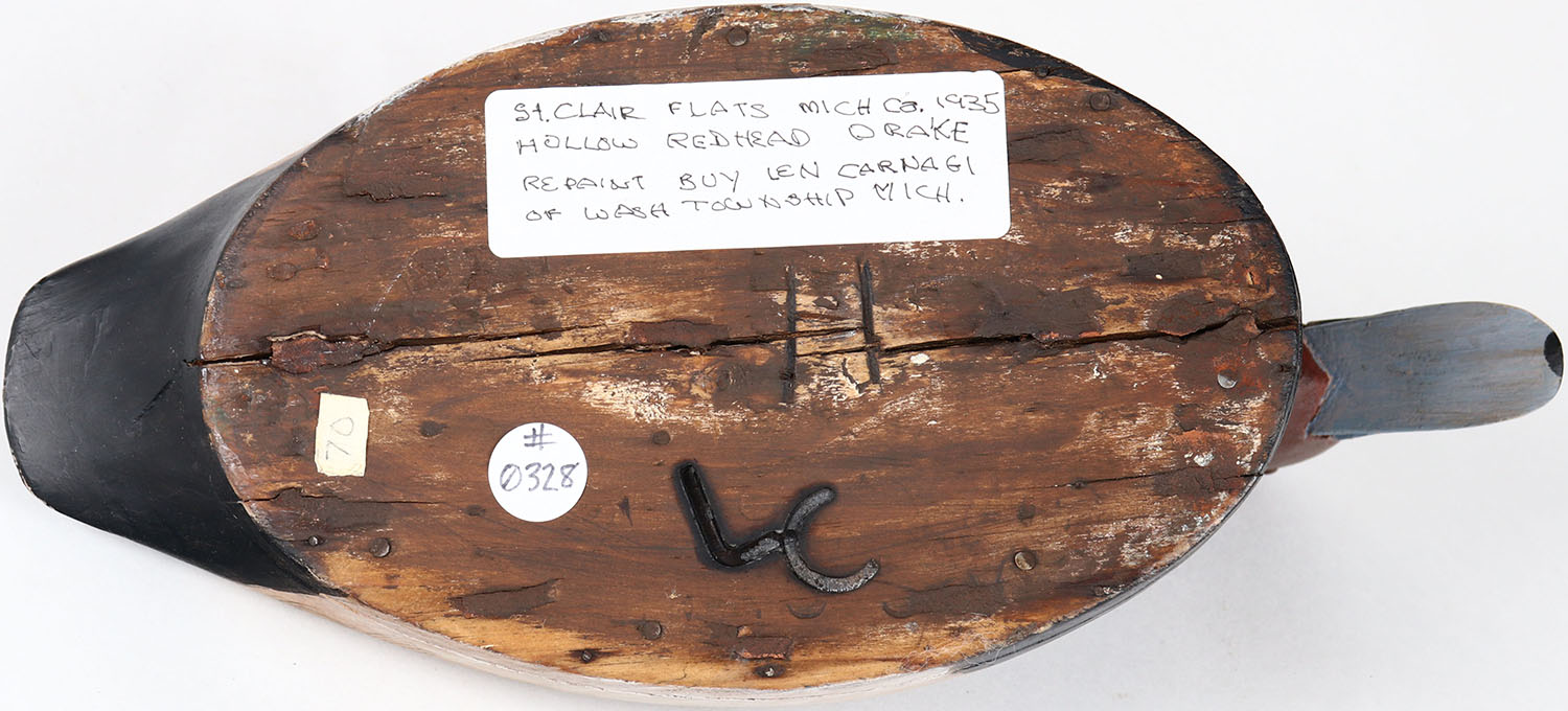 Redhead Drake by Len Carnagi, St. Clair Flats MI, painted eyes, has age crack on bottom, hollow wood, signed and branded on bottom, repainted. Grade: Very Good ++ - Value: 50 to 100