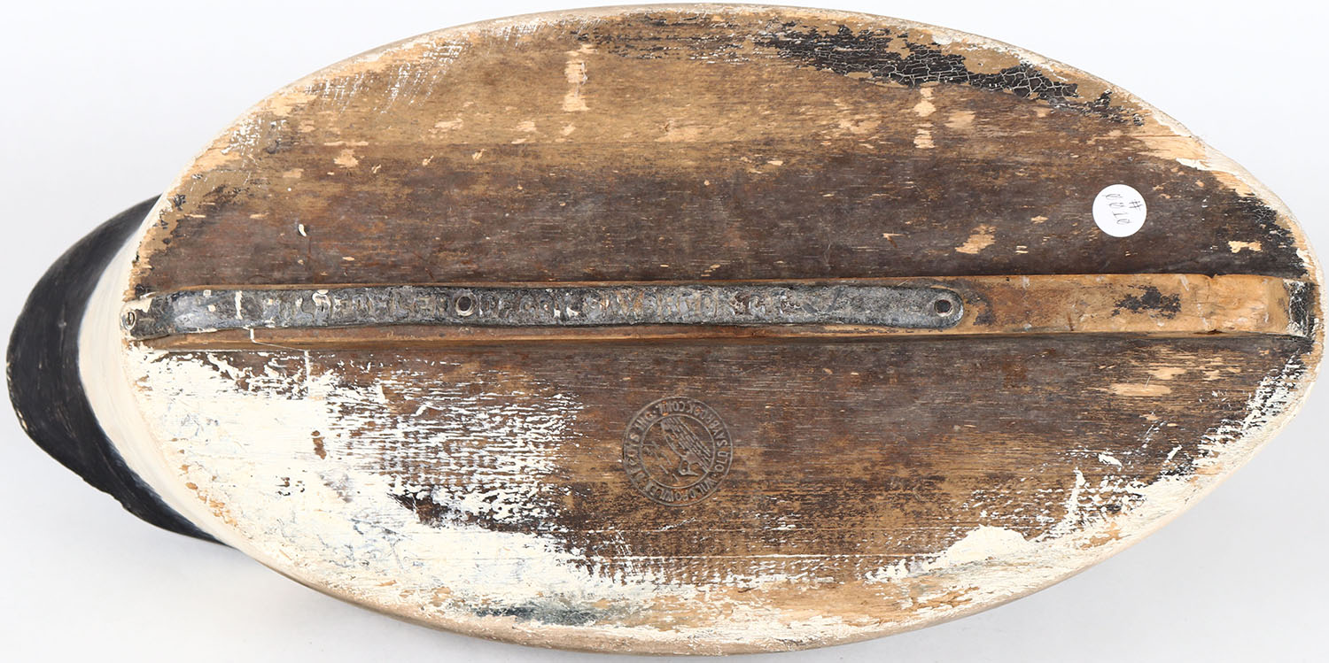 Canada Goose by Wildfowler Decoys Inc. Old Saybrook CT, glass eyes, head is cracked, solid wood, branded by WILDFOWLER DECOYS on bottom, original paint. Grade: Very Good ++ - Value: 100 to 200