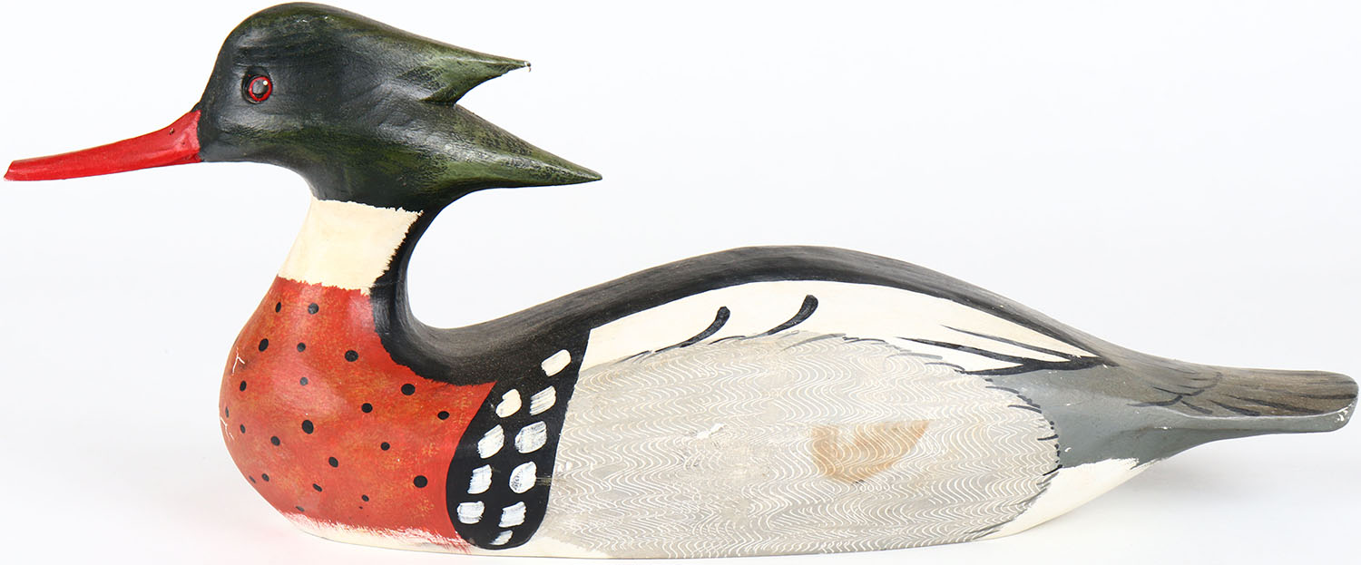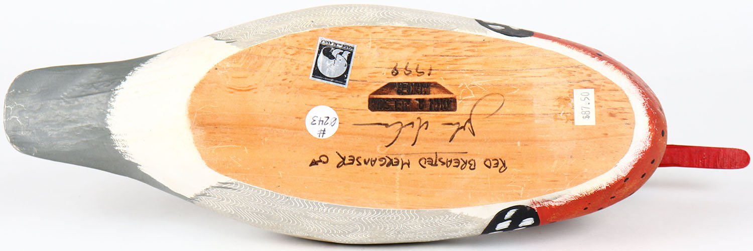 Red Breasted Merganser by John A. Nelson, glass eyes, structurally excellent, solid wood, signed on bottom, original paint with comb painting. Grade: MINT - Value: 30 to 60