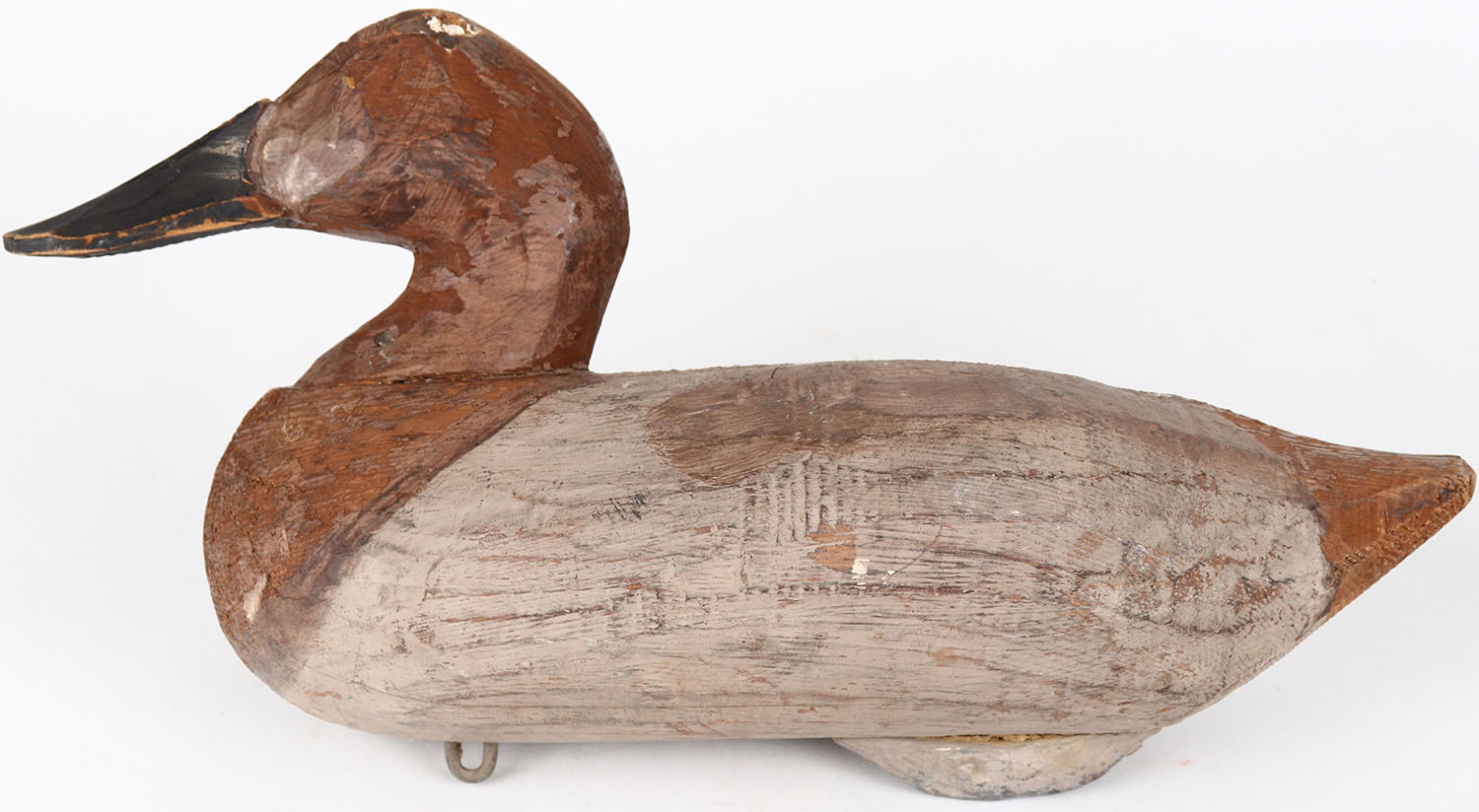 Canvasback Drake by unknown maker, Havre de Grace, MD, no eyes, has age cracks on back and bottom, solid wood, original paint. Grade: Excellent - Value: 60 to 150