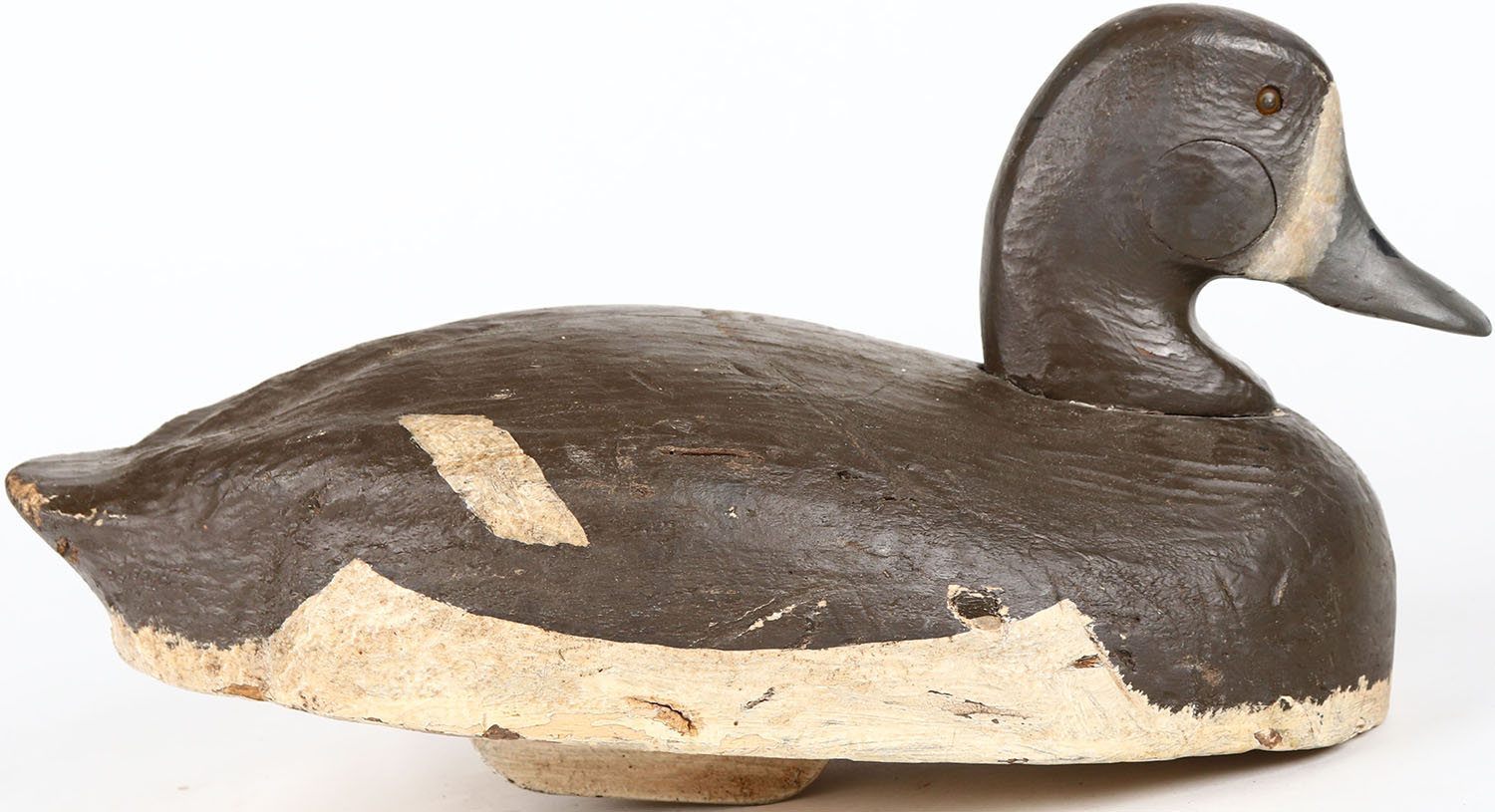 Bluebill Hen by Herters, glass eyes, structurally excellent, solid balsa wood, branded WH, original paint. Grade: Excellent - Value: 40 to 80