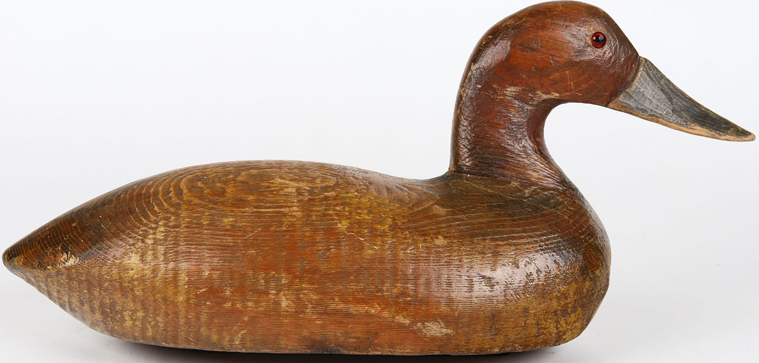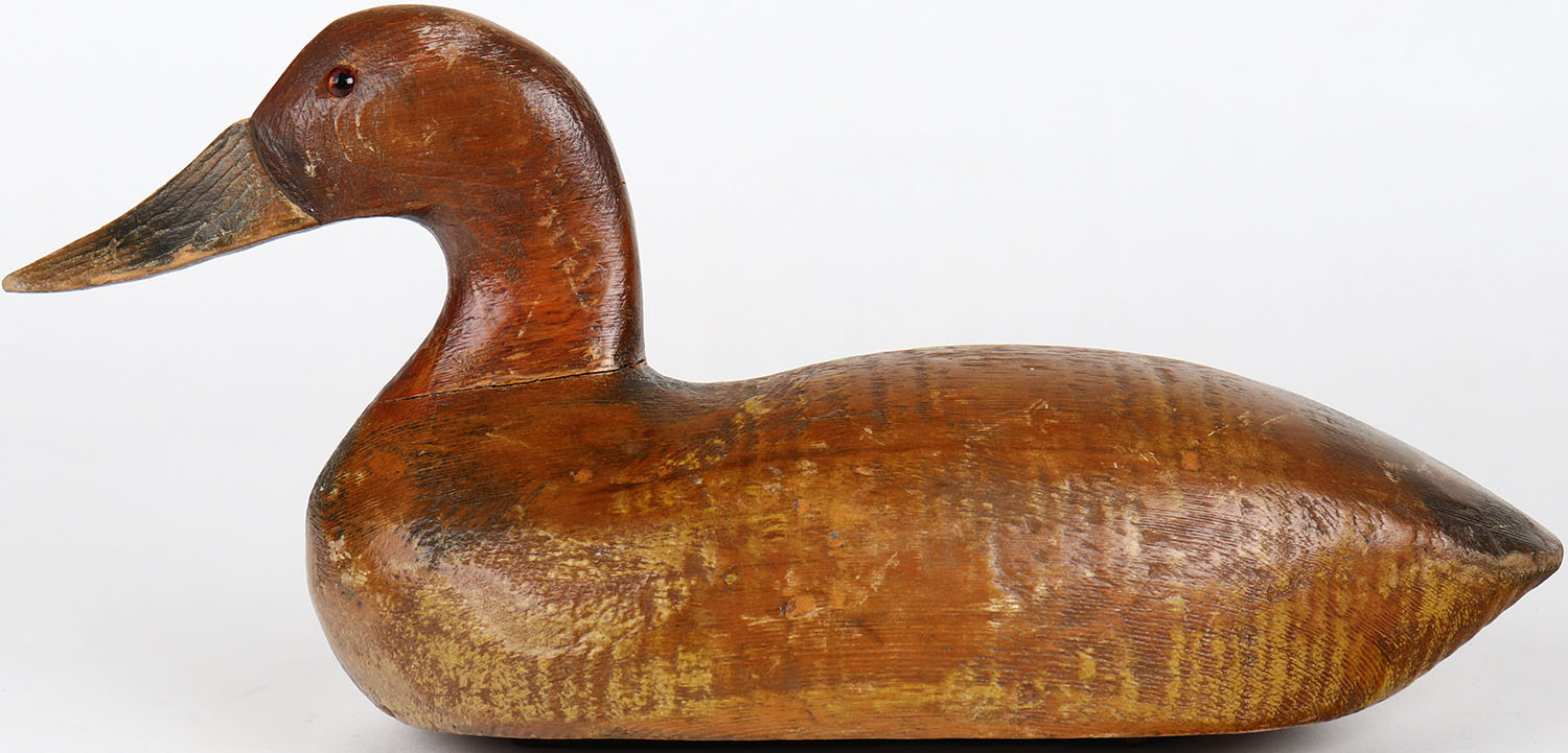 Canvasback Hen by unknown maker, glass eyes, neck has age crack, solid wood, original paint. Grade: Very Good ++ - Value: 30 to 60