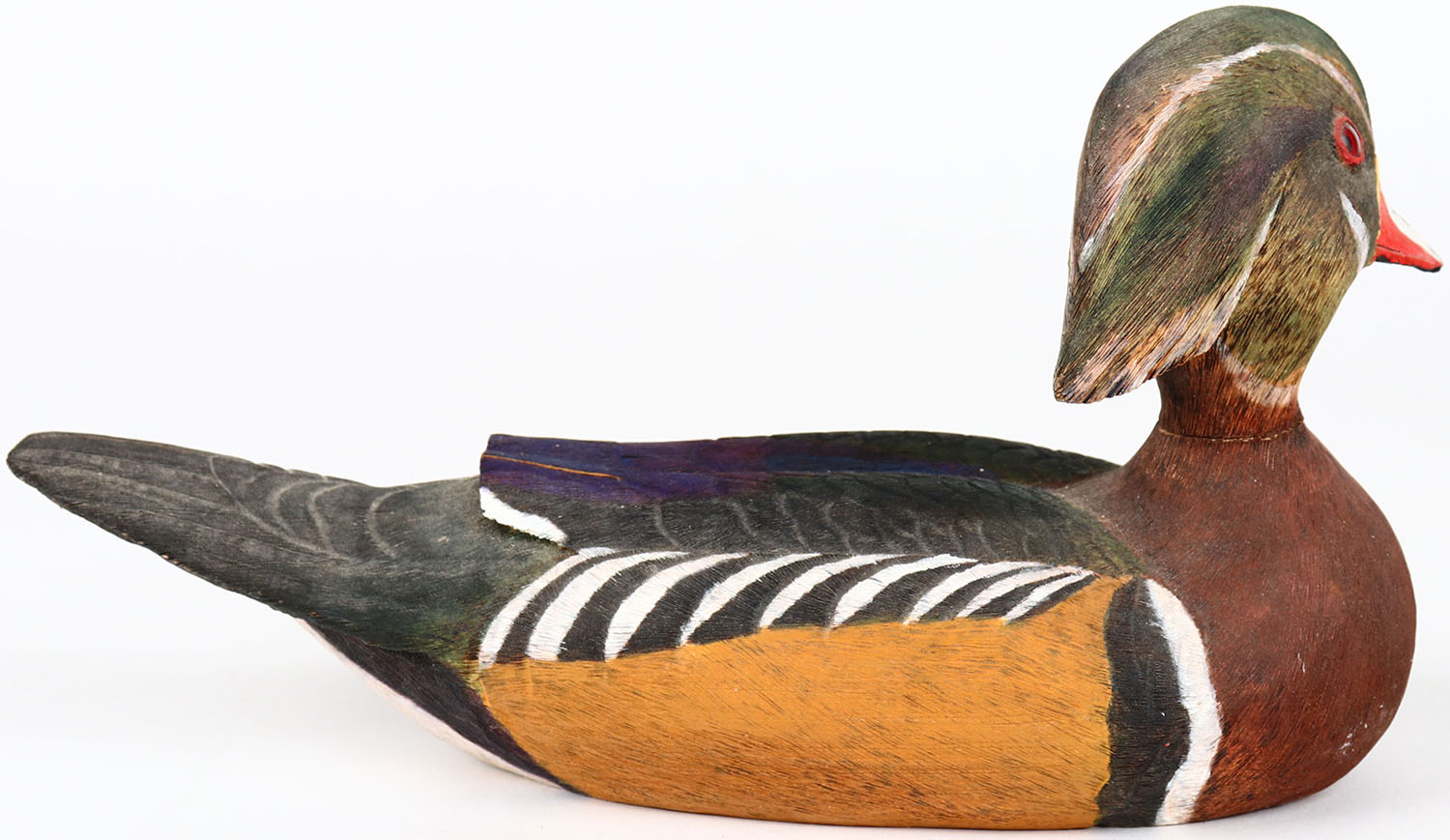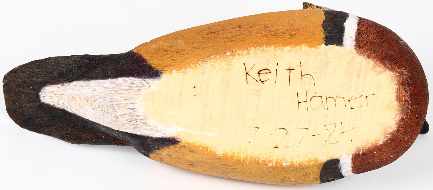Wood Duck Drake by Keith Hamer, glass eyes, neck has age crack, solid wood, signed on bottom, original paint. Grade: Very Good ++ - Value: 40 to 80