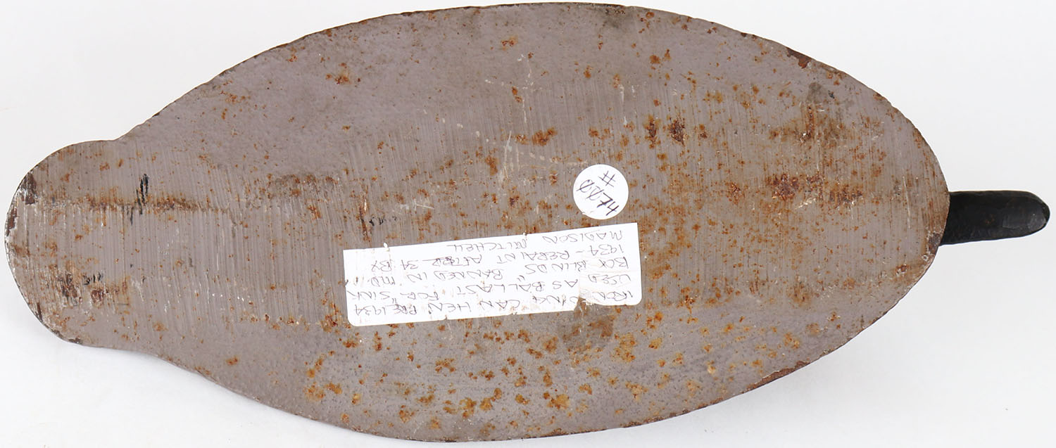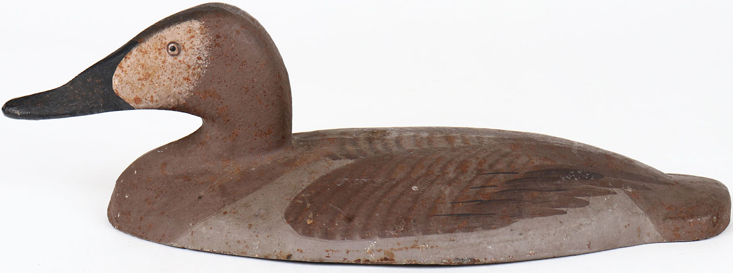 Iron Canvasback Hen repaint attributed to Madison Mitchell, used on SINK BOATS, painted eyes, structurally excellent, cast-iron body, signed on bottom, repainted. Grade: MINT - Value: 50 to 150