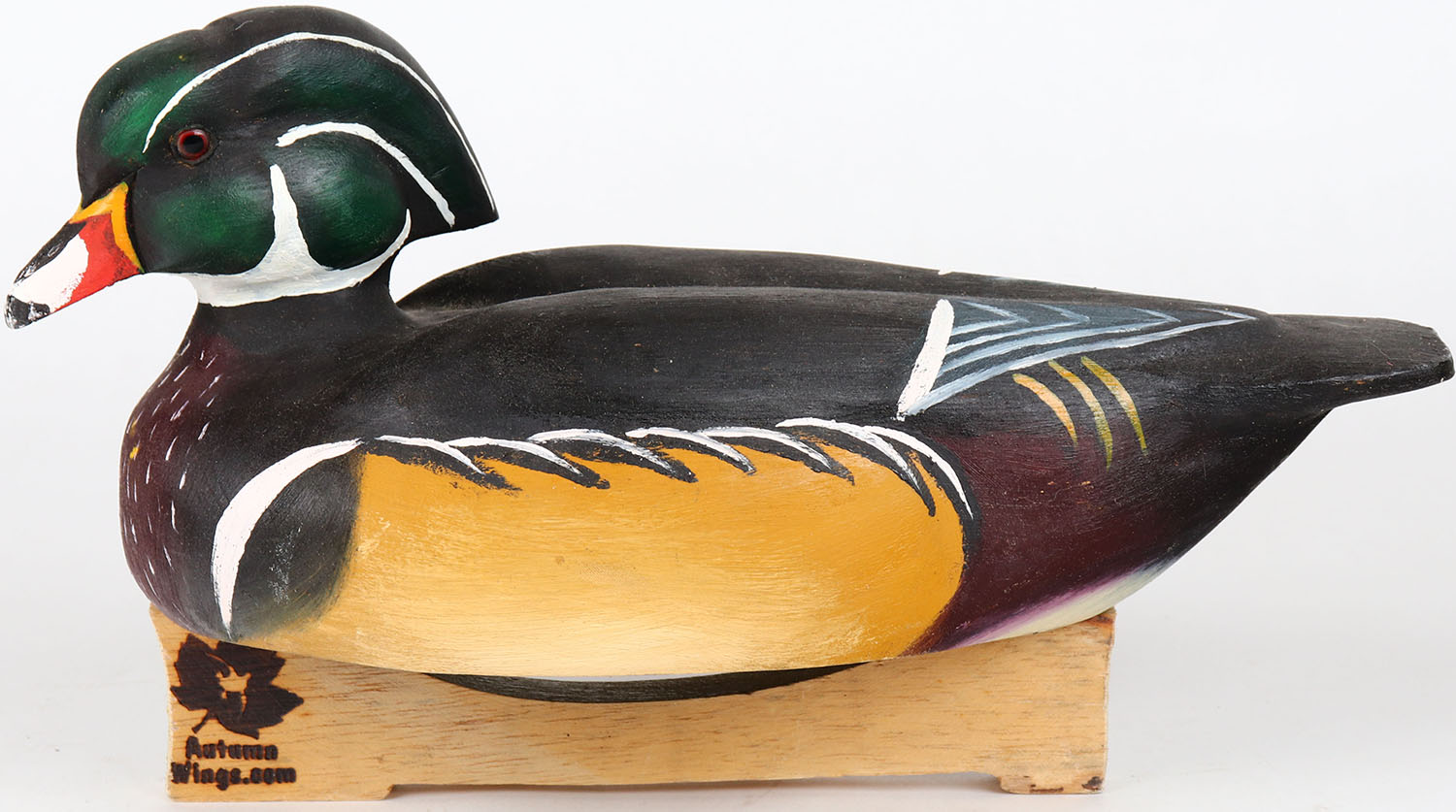 Wood Duck Drake by Autumn Wings Decoys, glass eyes, structurally excellent, hollow wood, branded by Autumn Wings Decoys on bottom, original paint. Grade: MINT - Value: 20 to 40
