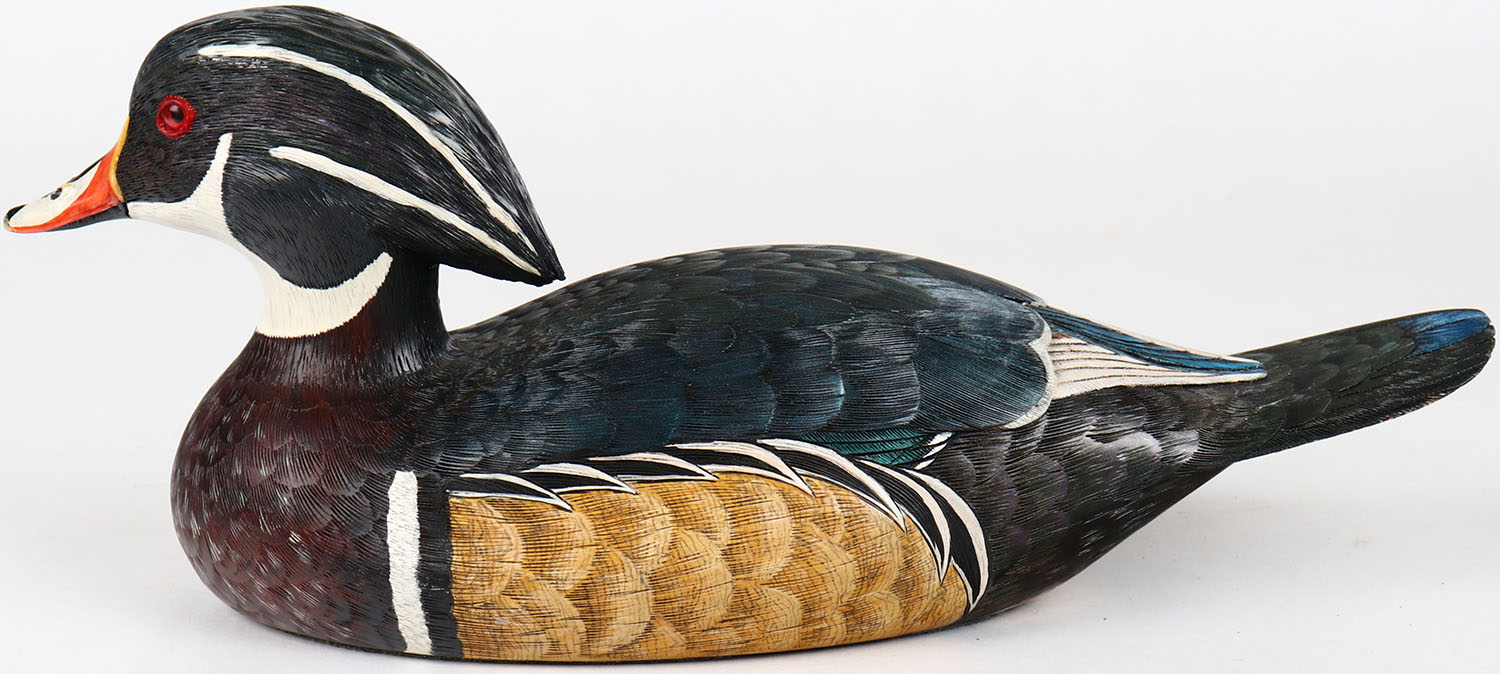 Wood Duck Drake by Bob Thompson, glass eyes, structurally excellent, solid bass wood / acrylic, signed and branded on bottom, original paint. Grade: MINT - Value: 30 to 60