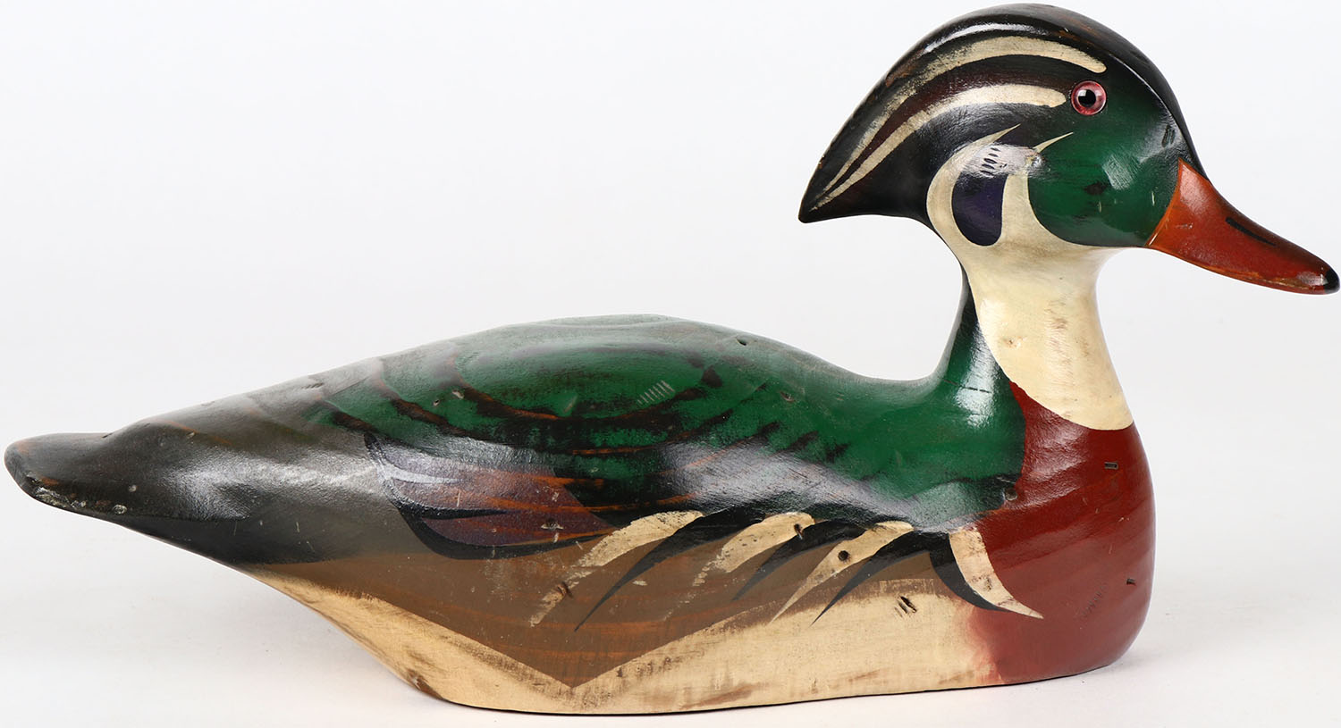 Wood Duck Drake by Raymond E. Howard, Hornick Bros Stoney Point Decoys, Oak Hall, Virginia, glass eyes, structurally excellent, solid wood, signed on bottom. Grade: Excellent - Value: 30 to 60