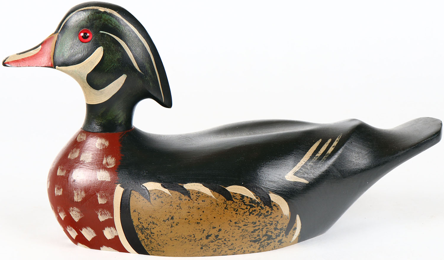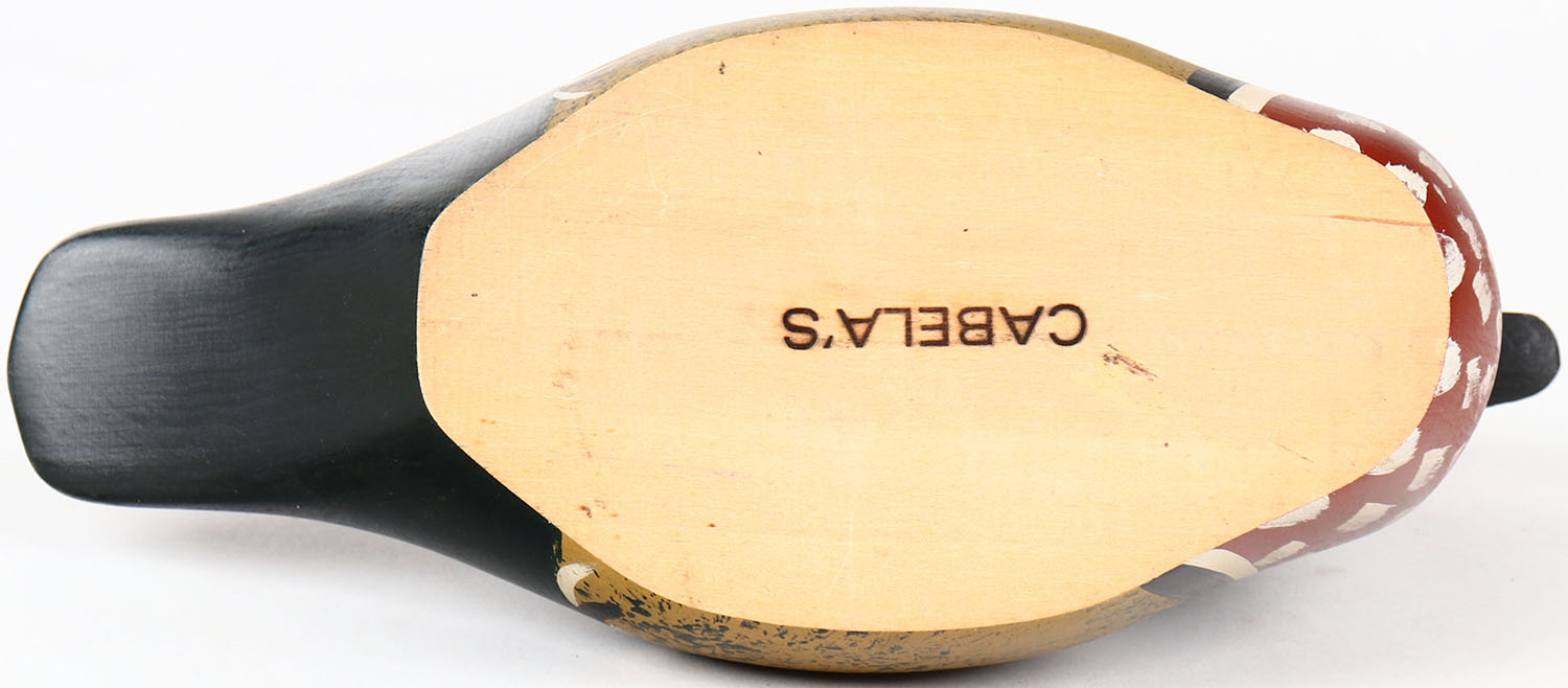 Wood Duck Drake by Cabela's, glass eyes, structurally excellent, solid wood, branded by CABELA'S on bottom, original paint. Grade: MINT - Value: 30 to 60