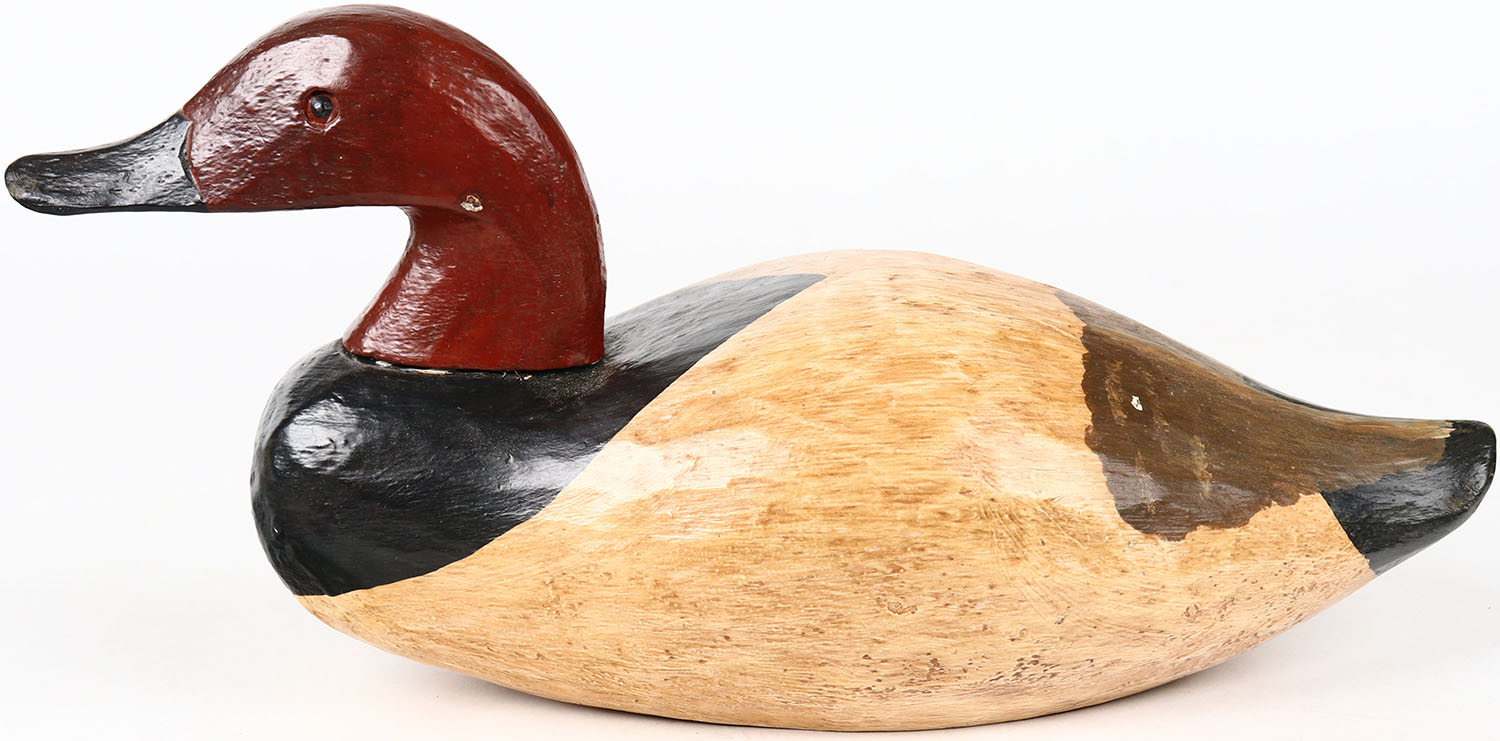 Canvasback Drake by unknown maker, painted eyes, head is loose, solid wood, signed on bottom, repainted. Grade: Very Good ++ - Value: 30 to 60