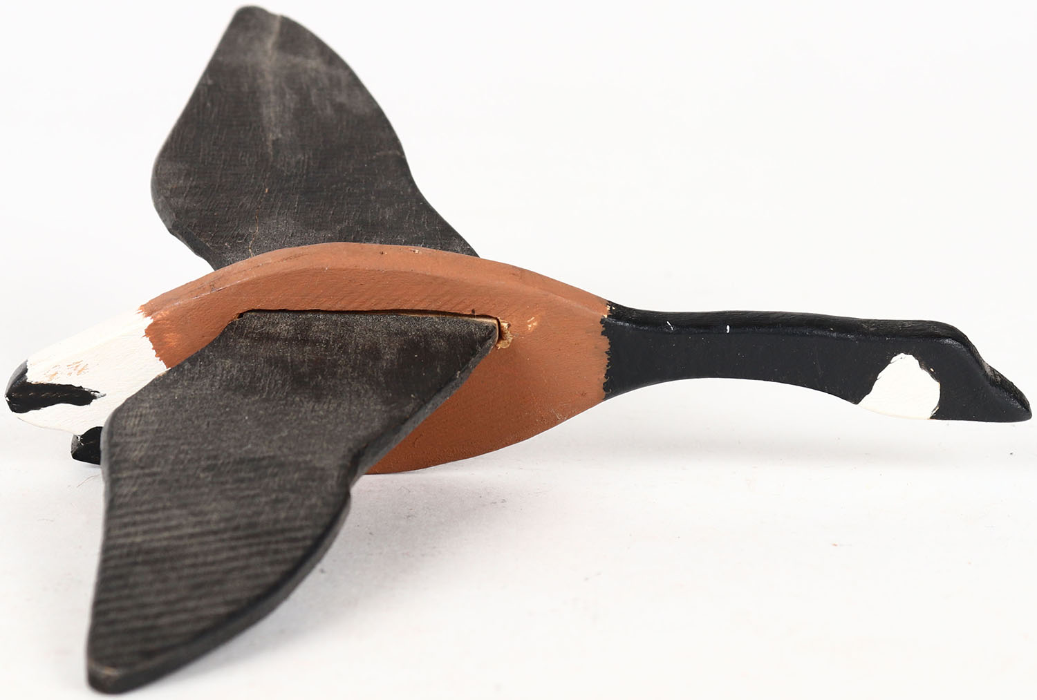 Miniature Flying Canada Goose by unknown maker, solid wood, painted eyes, original paint. Grade: Excellent ++ - Value: 10 to 20