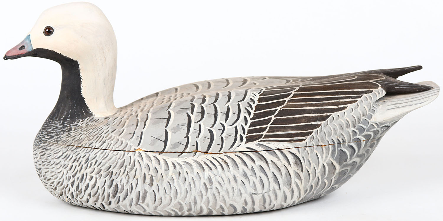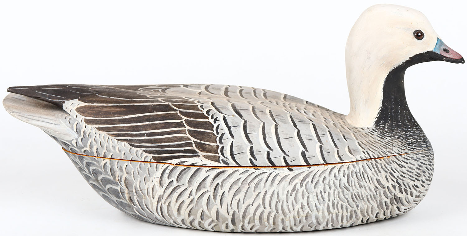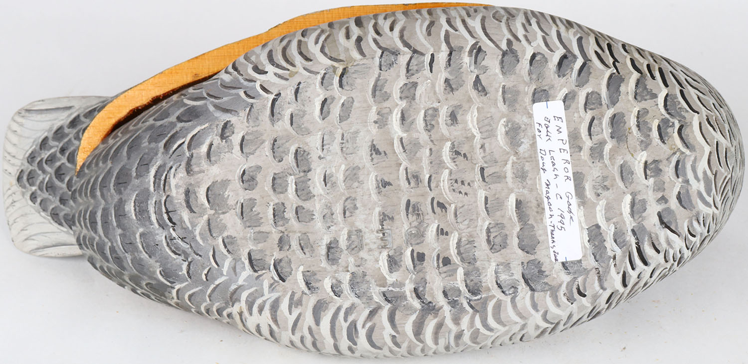 Emperor Goose by Jack Leach, Tacoma, WA, glass eyes, hollow wood, body is split in half, branded JEL on bottom, original paint. Grade: Very Good - Value: 100 to 200