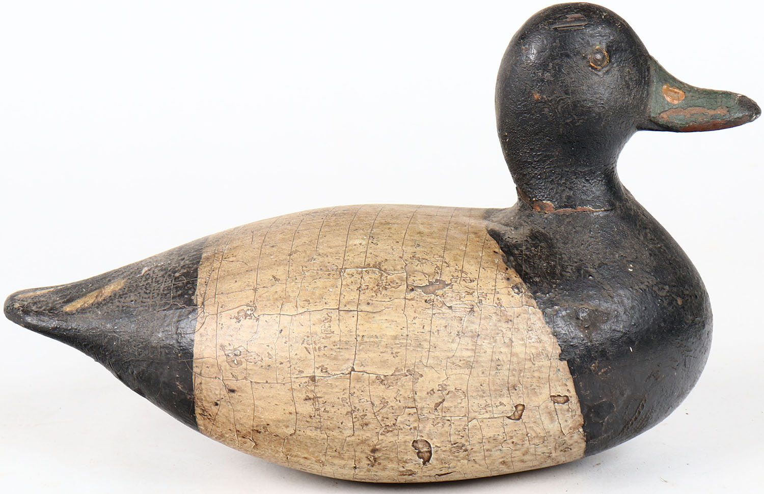 Bluebill Drake by unknown maker, IL, tack eyes, hollow wood, has age cracks on entire body, original paint. Grade: Very Good - Value: 100 to 200