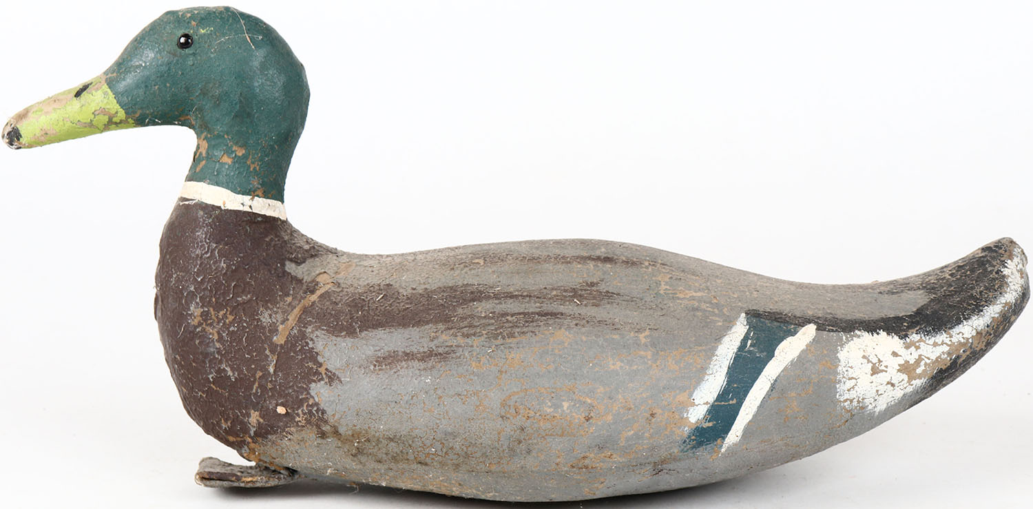 Mallard Drake by Scott Cork Decoy Company, PTD, Oakland, canvas over cork, glass eyes, original paint. Grade: Excellent - Value: 30 to 100