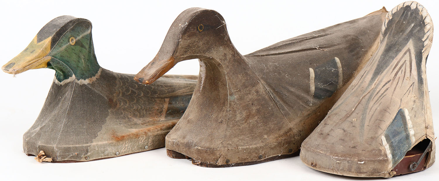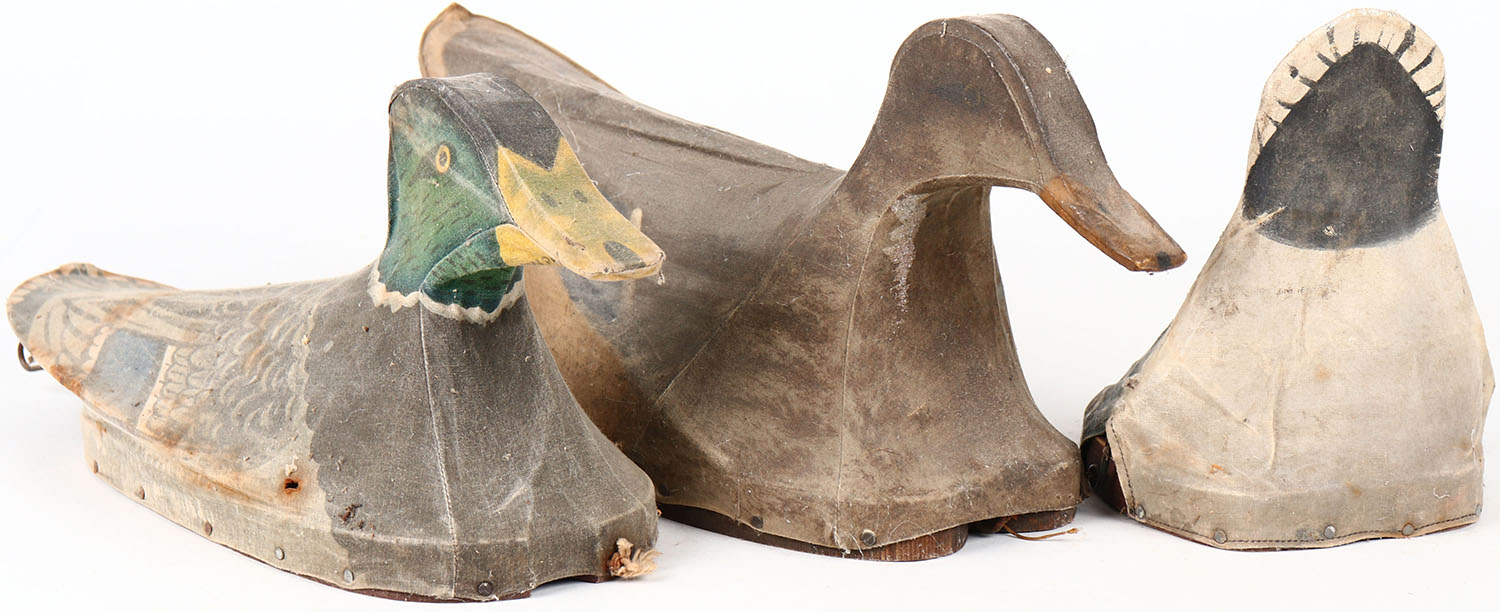 Unknown Maker, Set of 3 Decoys, canvas over wire, Mallard Drake, Mallard Hen & feeding duck decoy, original paint. Grade: Very Good - Value: 50 to 100