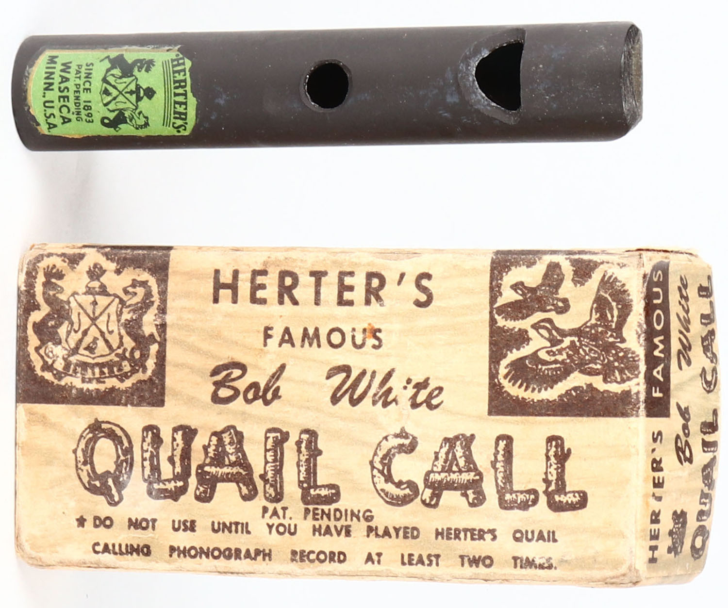 Herters Quail Call. Hard to find Model No. C36 with rare green water label. Box, Lodermeier Collection. Grade: Excellent - Value: 10 to 30