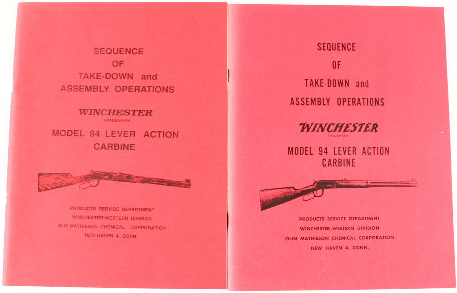 Lot of 2 Sequence of Take-Down and Assembly Operations, Winchester Model 94 Lever Action Carbine, both 8 1/2'' x 11''. Pages clean, staplebound. Grade: Very Good ++ - Value: 2 to 60