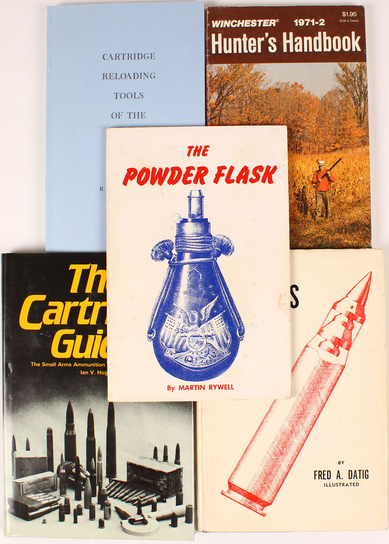 Lot of 5 (1) The Cartridge Guide by Ian V. Hogg, 6 1/2'' x 9 1/2''. 192 pages. (1) Cartridges for Collectors Volume II by Fred A. Datig, 6 1/2'' x 9''. 176 pages. (1) Cartridges, Reloading, Tools of the past by R.H. Chamberlain and Tom Quigley, 5'' x 8 1/2''. (1) Winchester 1971-2 Hunter's Handbook, 5'' x 8 1/2''. 188 pages. (1) The Powder Flask by Martin Rywell, 6'' x 9 1/2''. 81 pages. Grade: Excellent - Value: 2 to 100