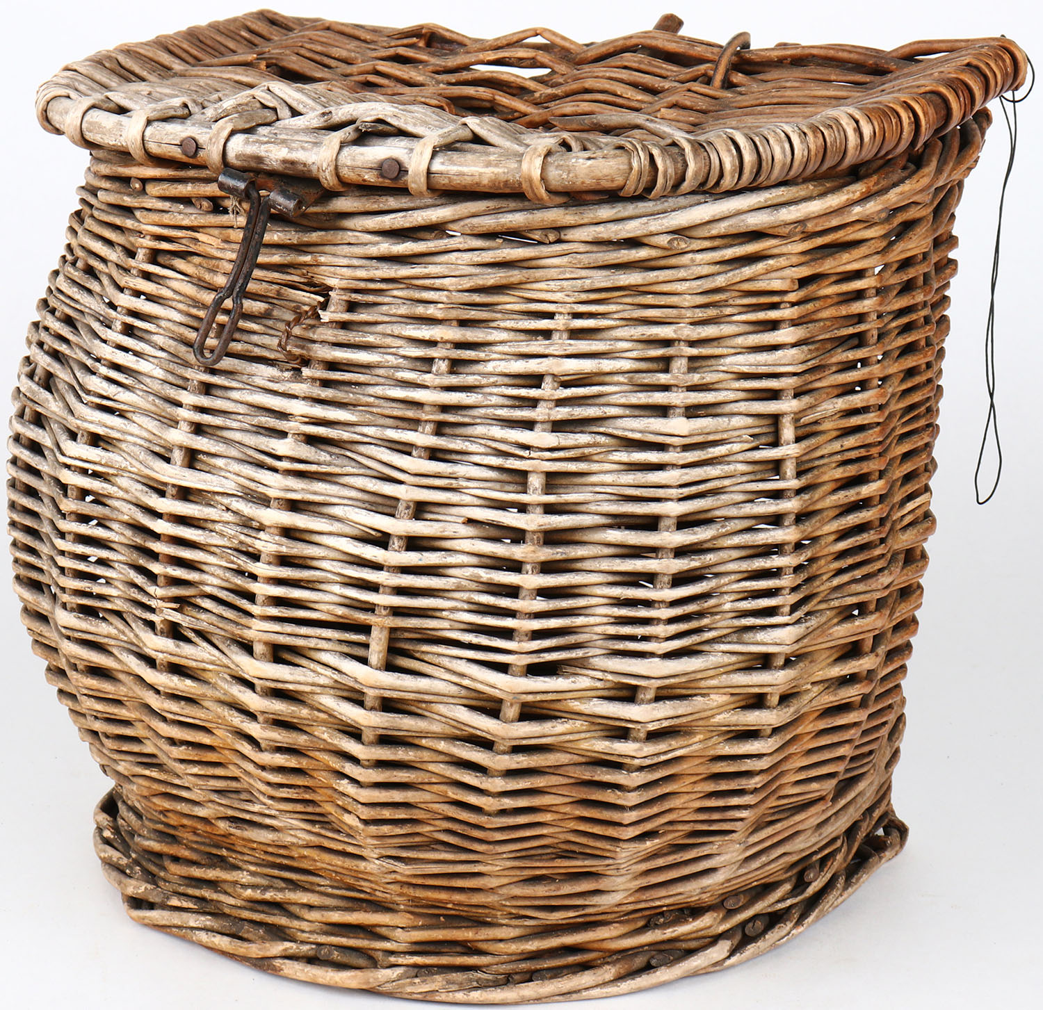 Unmarked Center hole creel, leather/metal clasp on top is attached and functioning, 12 at base, tight weave on basket has a little damage to top only, leather strap with tooling, nice creel. Grade: Very Good ++ - Value: 30 to 150