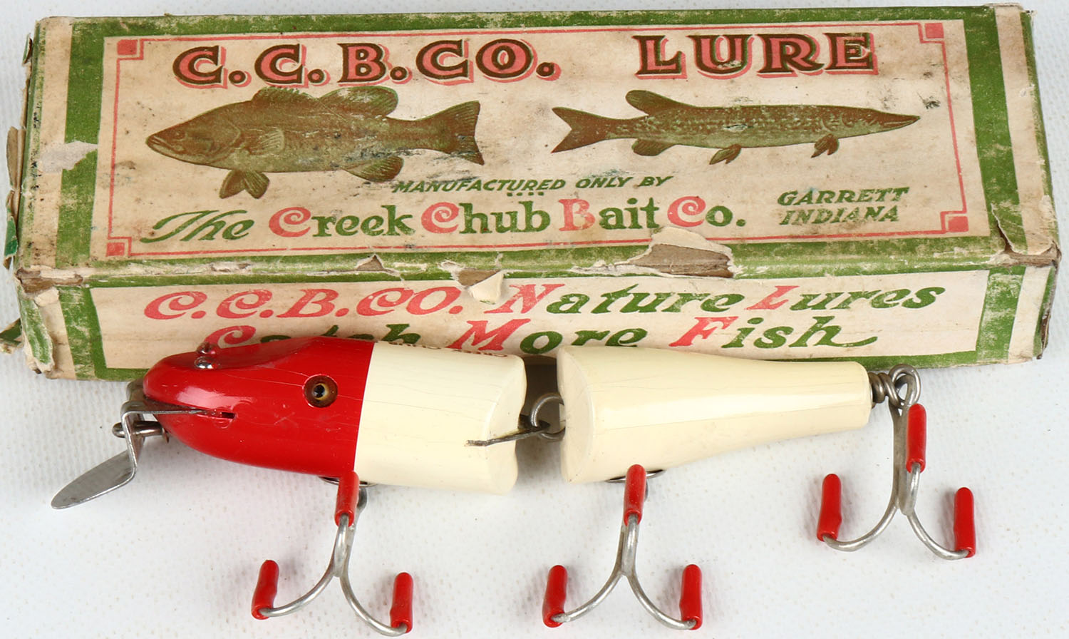 Creek Chub Jointed Snook Pikie Minnow in original box, white & red, GE, 3 hook, some crazing to paint. Grade: Excellent - Value: 10 to 60