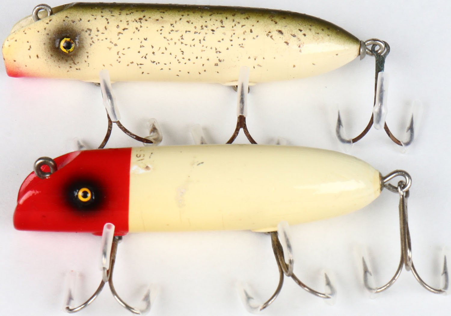 Lot of 2 South Bend Babe-Orenos, wood lures, TE, red & white plus a cream flash. Grade: Excellent - Value: 10 to 60