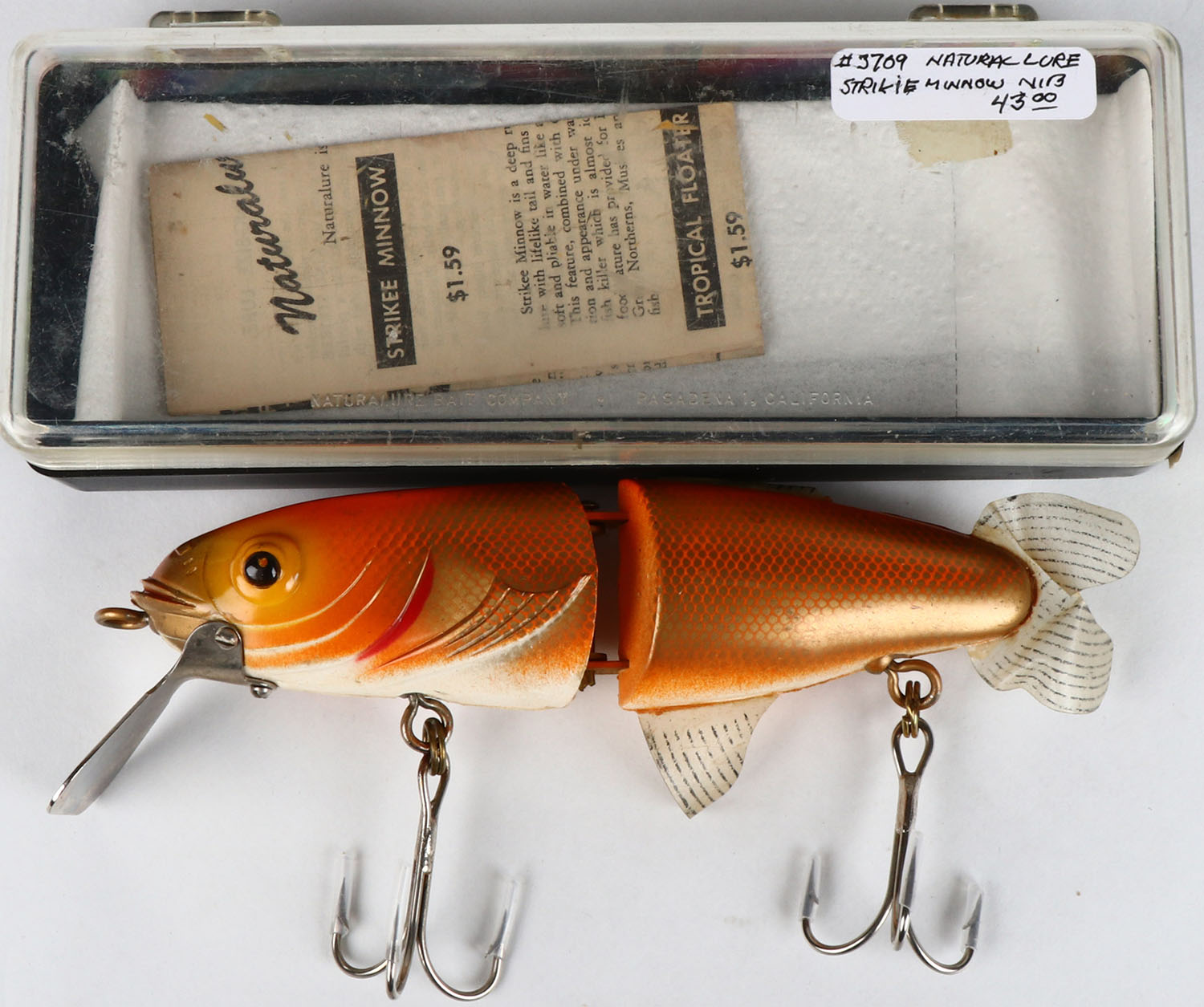 Natural lure bait co., Jointed King Size lure in the original box, orange, PE, metal lip, 2 hooks. Grade: Excellent - Value: 10 to 50