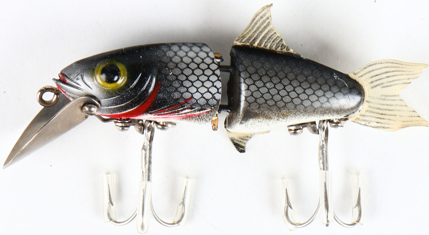 Jointed lure, gray/black scale, has metal lip, PE, 2 hooks. Grade: Excellent + - Value: 6 to 30