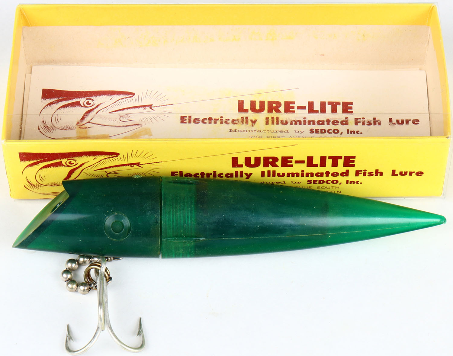 LURE-LITE, Seattle, Wash, Electrically Illuminated Fish Lure in original box, No. 6 green. Grade: Excellent ++ - Value: 20 to 60