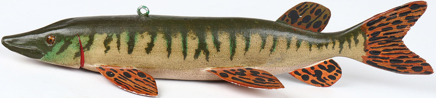 | Signed Ice Fishing Decoy, GE, Pike, has 6 metal fins, 9 1/2'' ...