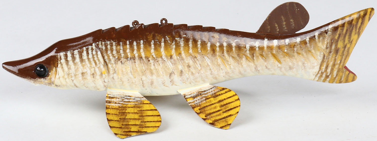 Carl Christiansen Ice Fishing Decoy, Sturgeon, GE, Signed C.C. on bottom, has 5 metal fins, 7'' OAL. Grade: MINT - Value: 50 to 200