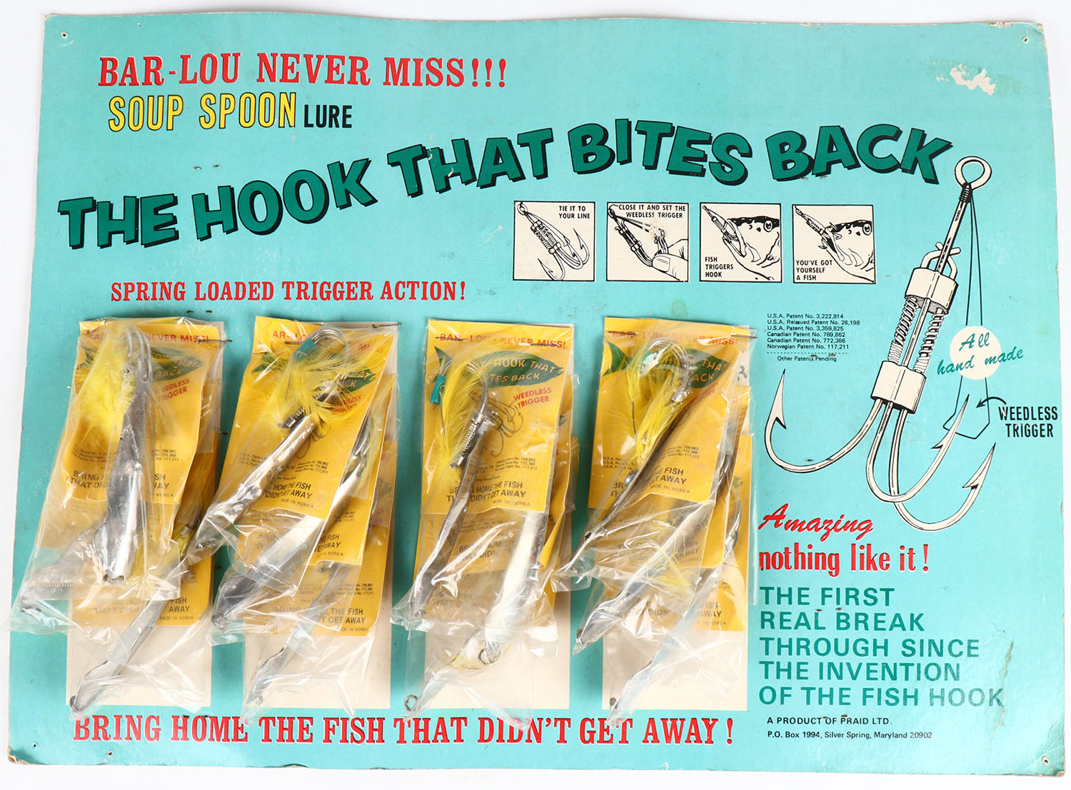 Full Card of BAR-LOU never miss!!! Soup Spoon lure, the hook that bites back, 12 total lures, has great graphics on front, has double easel back so you can display on counter, 19'' x 14'' Grade: Excellent - Value: 10 to 100