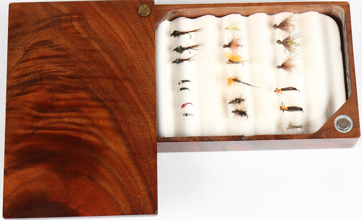 Hand Made Burl wood fly box by Tom Brauch and so marked, has 19 flies inside, 4 1/2'' x 3''. Grade: Excellent ++ - Value: 30 to 200