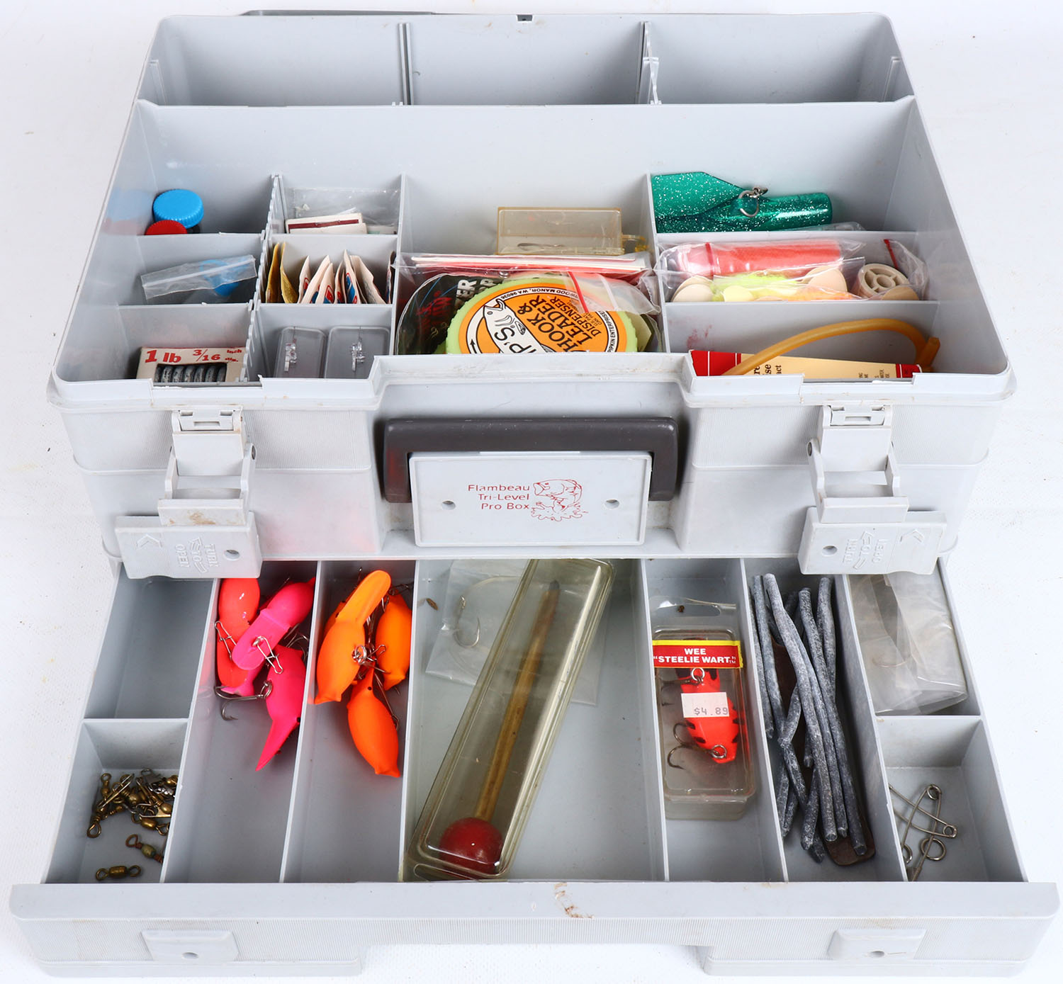 Steelhead/Salmon fishing tackle box by Flambeau, full of corkys, hotshots & other fishing gear, 15'' x 11'' x 7''. Grade: Excellent - Value: 10 to 80