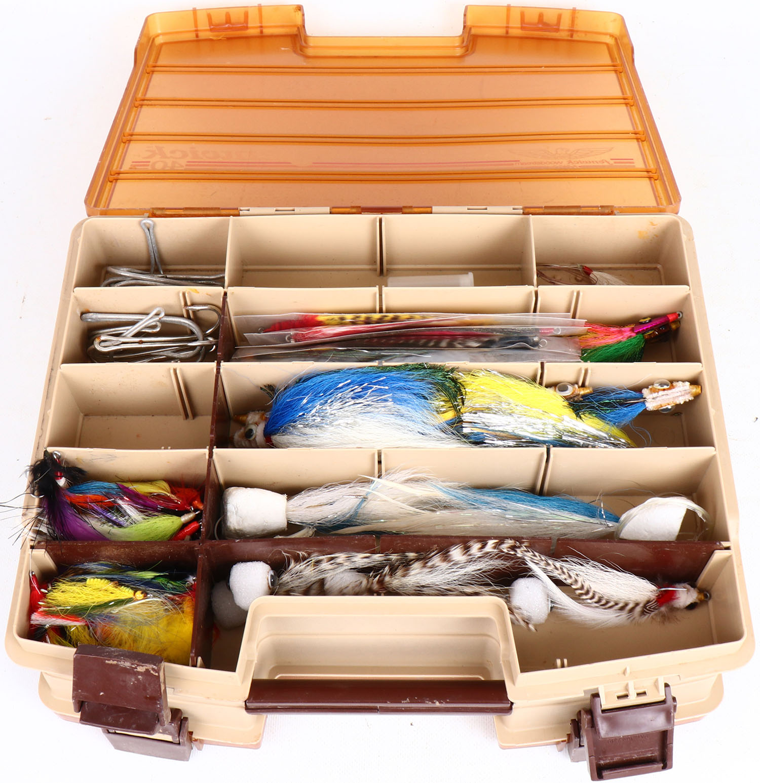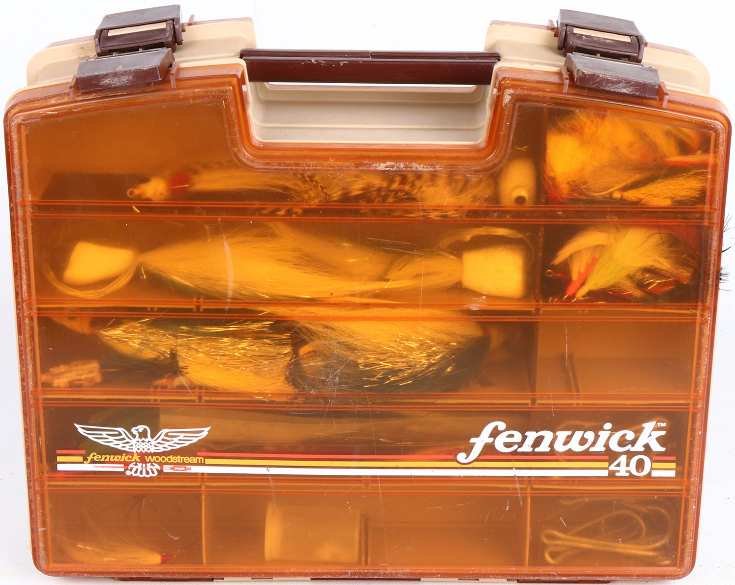 Fly Fishing Tackle Box full of flies for salmon, box made by Fenwick, 15'' x 12'' x 5''. Grade: Excellent - Value: 20 to 100
