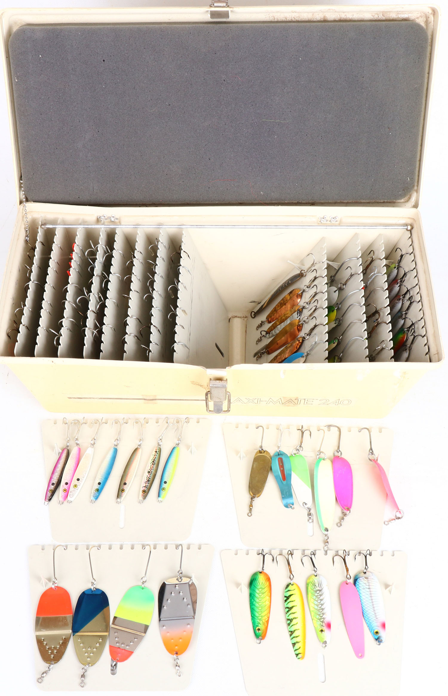 Lot of 95 Salmon Spoons in a Maxi-Mate 240 tackle box. Grade: Very Good ++ - Value: 30 to 250