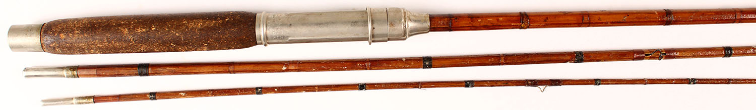 Winchester 3 Pc. Split bamboo fly rod No. 6080, 8', all orignal wrapping, missing two mid section guides, some wraps are loose, tip is 2'' short, cork handle has darkened from age, well marked on reel seat, highly collectible condition. Grade: Very Good ++ - Value: 50 to 150