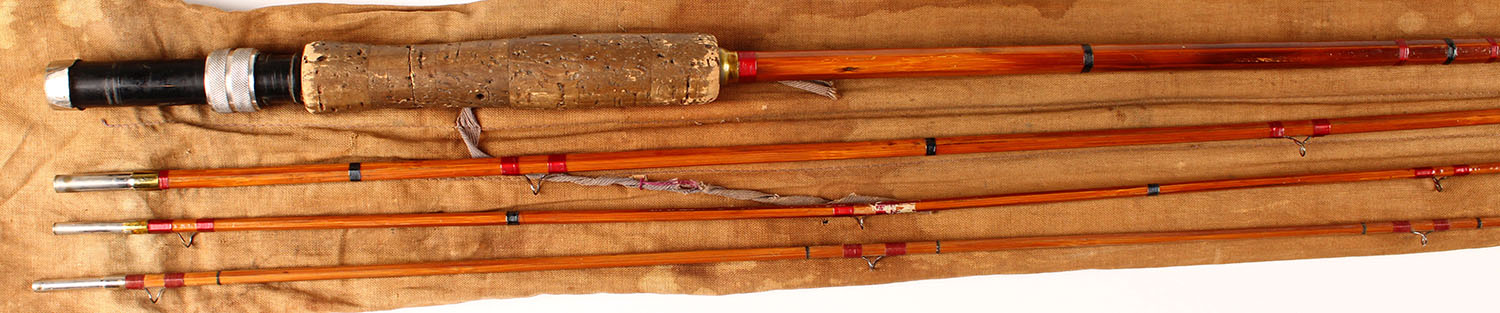 Bamboo Fly Rod (South Bend?), 9', 3/2, all original, cork handle has darkened from use, has unmarked cloth bag & tube. Grade: Very Good ++ - Value: 10 to 100