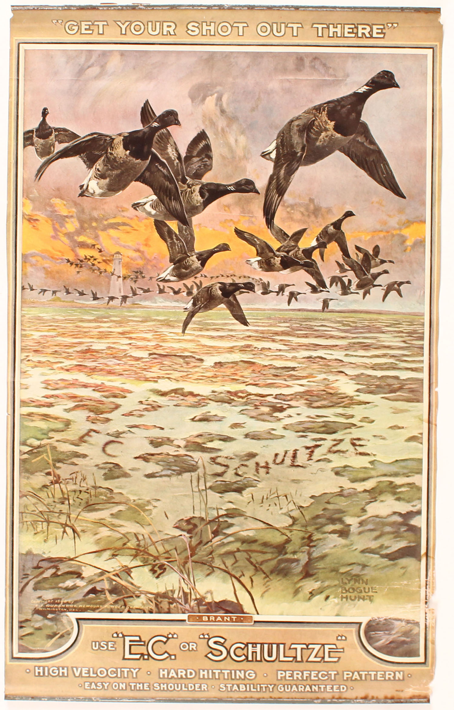 E.C. Schultze, Dupont Gun Poster, ''GET YOUR SHOT OUT THERE'', Wonderful full color image of Pacific Black Brant in flight with sunrise in background, by Lynn Bogue Hunt, has metal bands top & bottom with brass hanger, 15 1/2'' x 25 1/2'', has some wear to bottom right otherwise very nice colors, dated 1909, 100% all original condition, no repairs, last one we had brought over $3300.00, HARD TO FIND POSTER! Grade: Very Good ++ - Value: 1000 to 3000