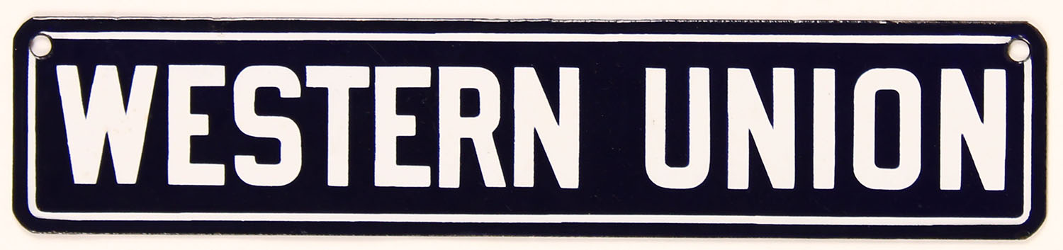 Western Union porcelain two sided sign, blue & white, 13'' x 2 3/4''. Grade: Excellent ++ - Value: 50 to 150