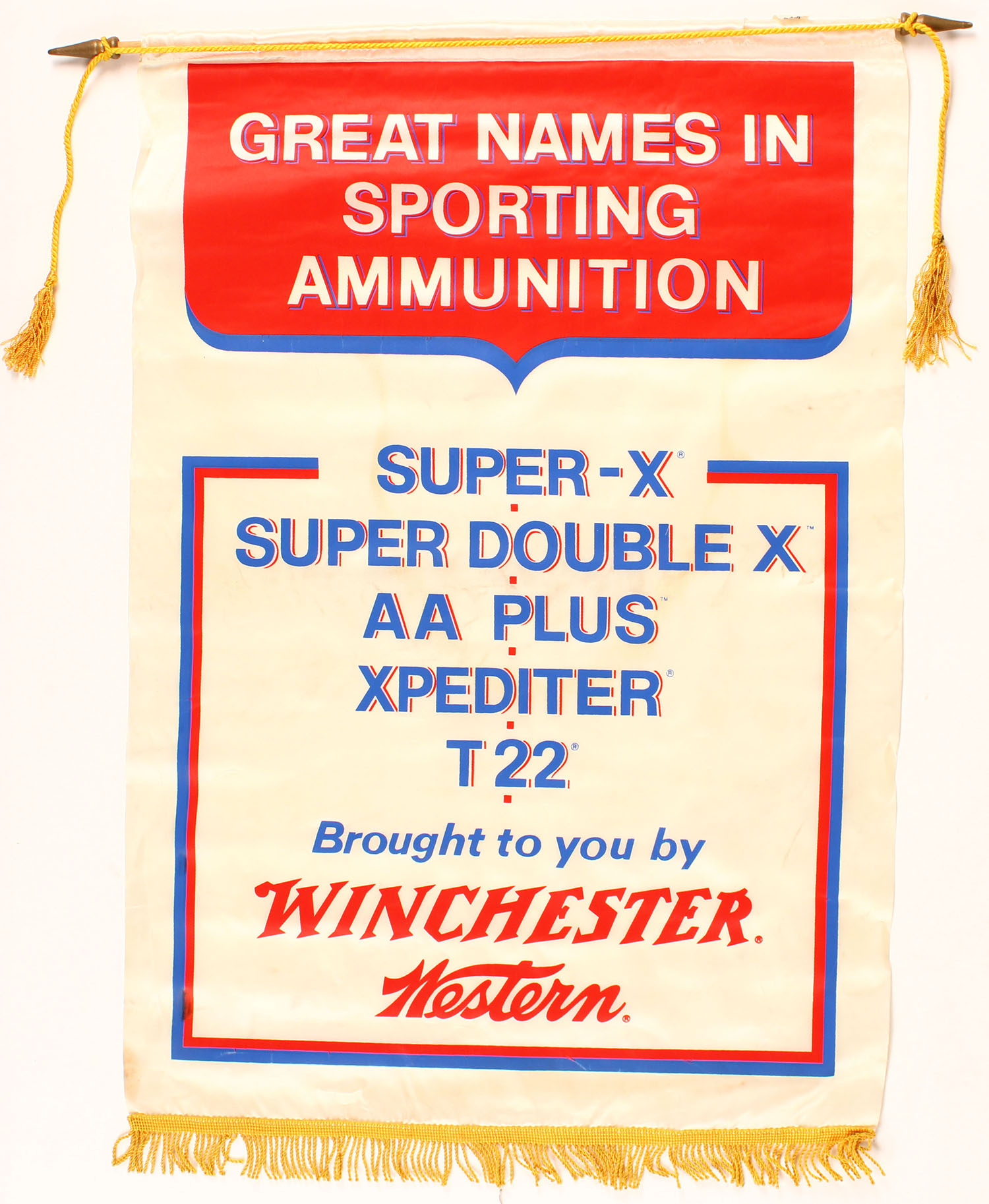 Winchester Western Banner, white, red & blue, 22'' x 32'', has wood dowel & string. Grade: MINT - Value: 50 to 200